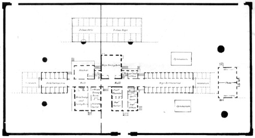 “2. Two buildings projecting from the rear of the main building; the one in the male department, two stories in height, and containing the chapel and the boys’ dining-room; the other in the female department, three stories in height, and appropriated for the kitchen, the wash-room, store-rooms, &c.
