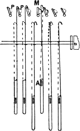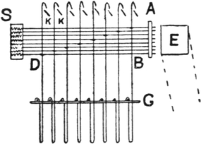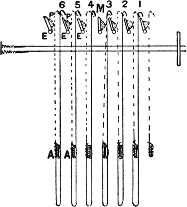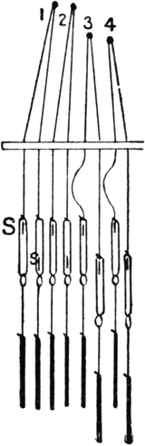 4. Yorkshire dressing, by which the required number of threads of each colour are split off reserve ball warps. The warp-ends thus split off are subsequently passed, in groups of two to four, through the dents of a reed in proper order, according to the required warp pattern, and wound on to a weaver’s beam.