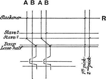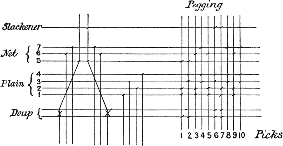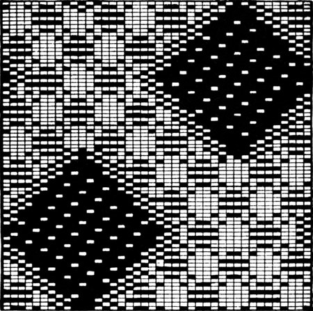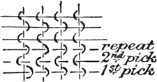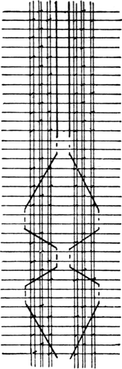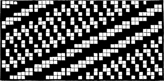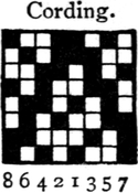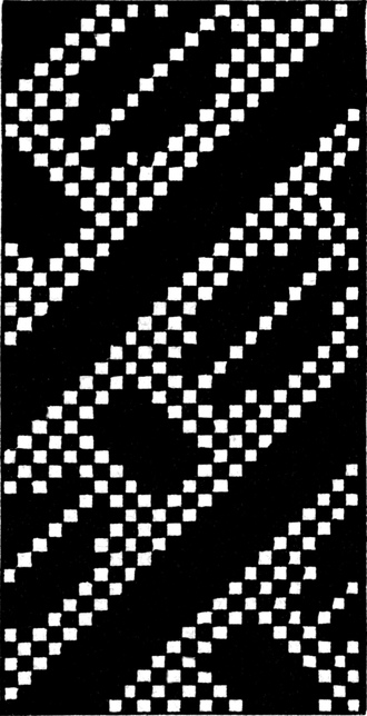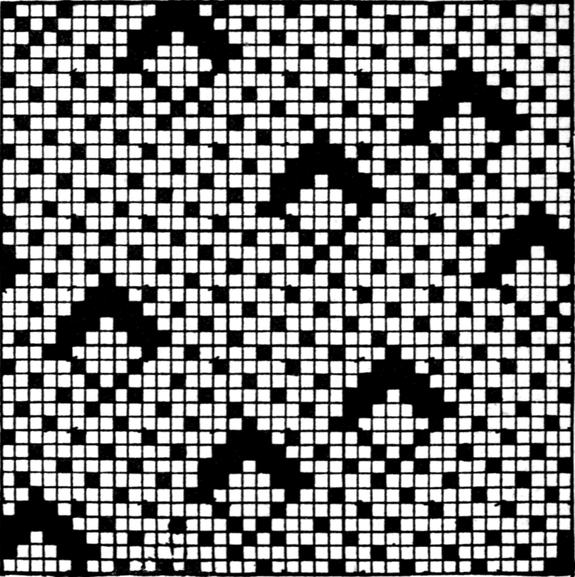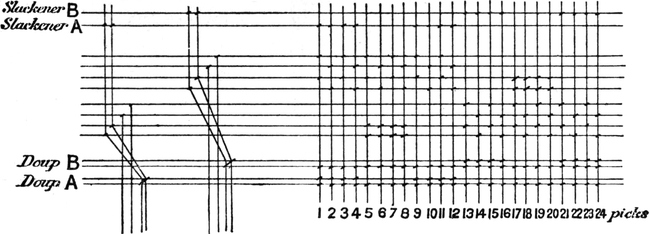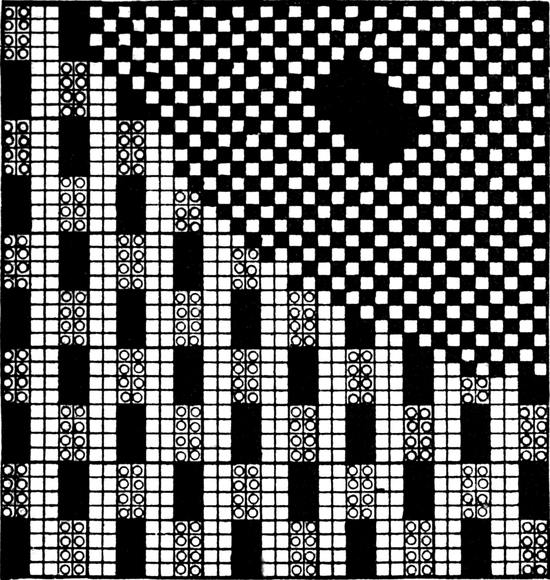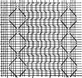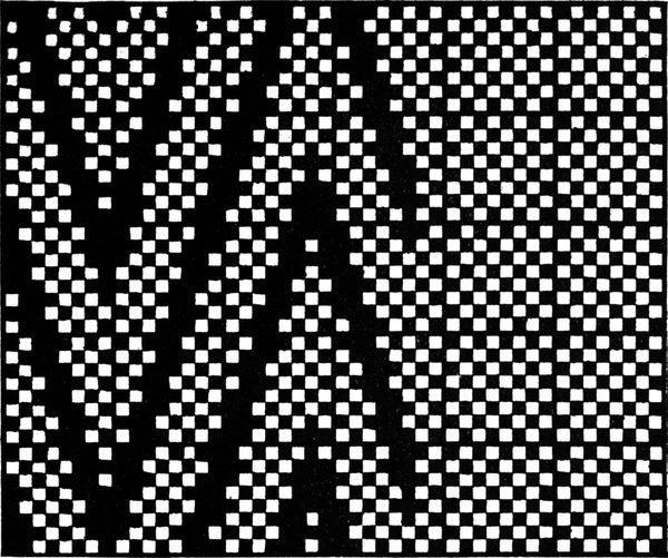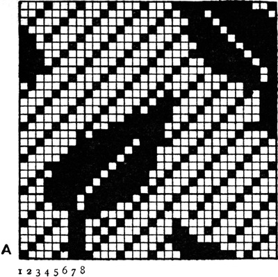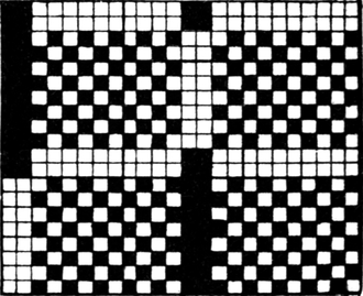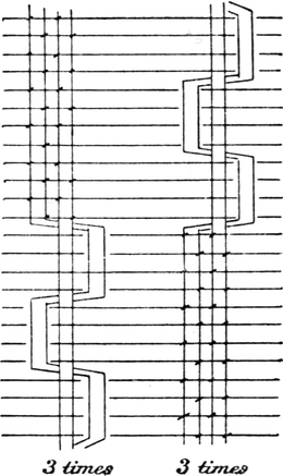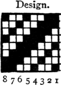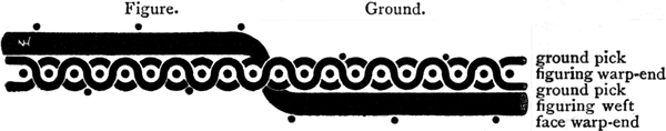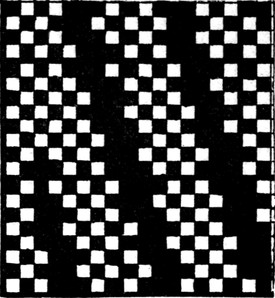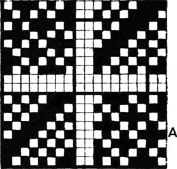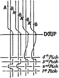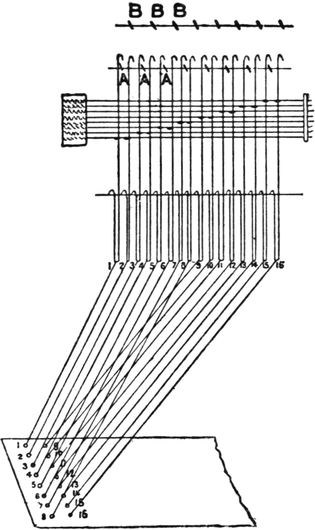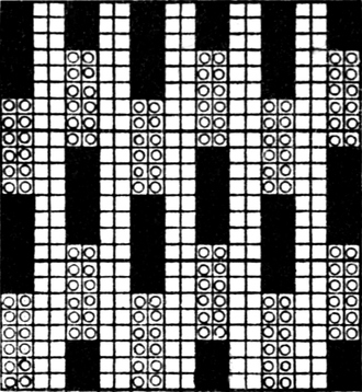 One advantage gained by a knowledge of the principle of[Pg 343] cloth “balance” is that the number of picks per inch which a given pattern or weave will take can easily be obtained by calculation. This is of great advantage to designers for Jacquard weaving, as it often occurs that a design is made and the cards cut for a pattern which will not admit of the required number of picks of the given counts being put in the cloth, which a slight alteration in the ground weave would have rendered possible.