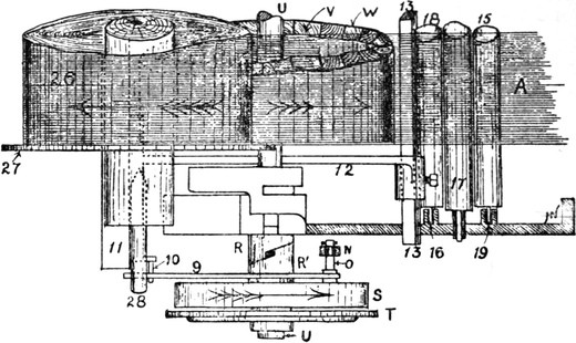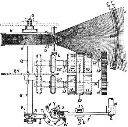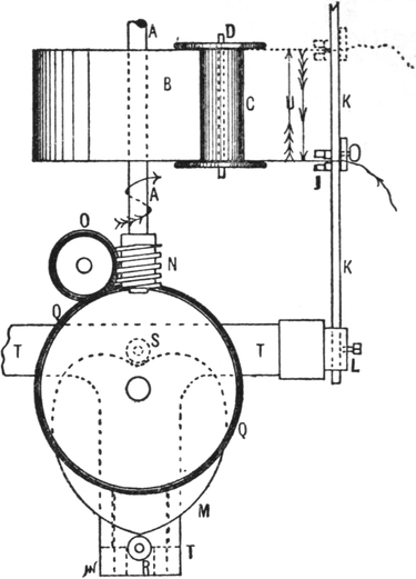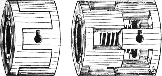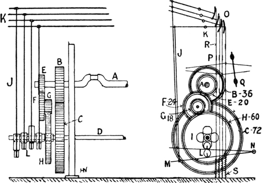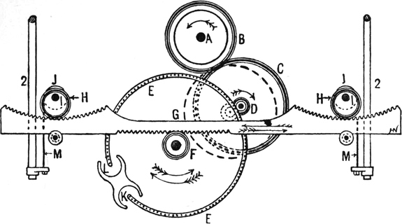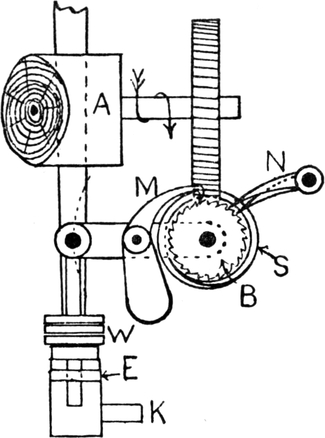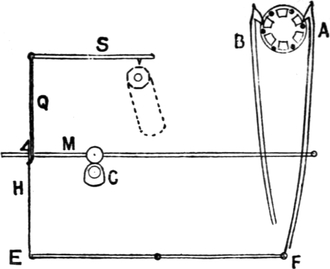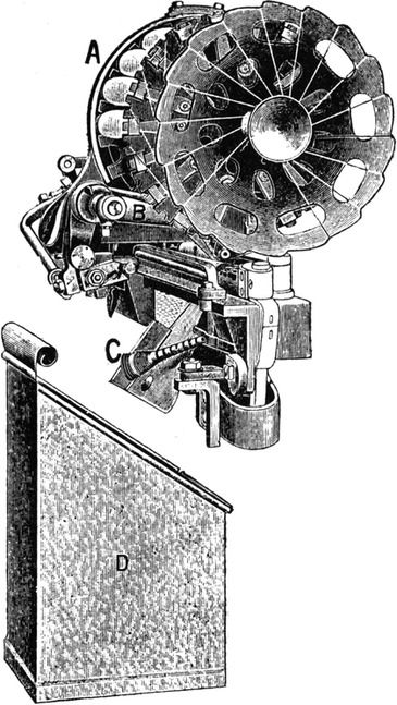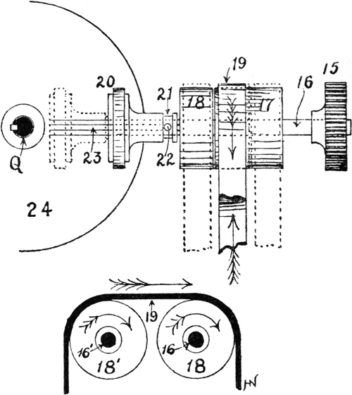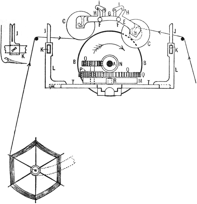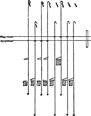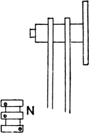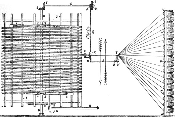 2. Ball warping, in which a number of threads are withdrawn from warpers’ bobbins and condensed into the form of a rope of untwisted strands. This operation may be accomplished by several types of machines. The one usually employed is the old-fashioned warping mill, which coils warp-ends on to a large revolving reel or swift, from which they are subsequently withdrawn and formed into a large ball. Ball warps are also sometimes formed direct from warpers’ bobbins; also sometimes from sections formed by a sectional warper; and sometimes by means of a linking or chaining machine.
