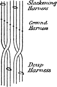 If the threads of a new warp are similar in number and counts to those of the finished warp, and are to pass through the shedding harness and reed also in a similar manner, it is more economical to twist the threads of a new warp separately to the corresponding threads of the old warp, and then draw the twisted portion of the warp bodily forward through the healds and reed. If, however, the number of threads and counts are greatly dissimilar, or if a different drafting is required, then recourse must be had to drawing new warp-ends through the harness and reed.