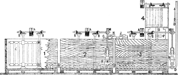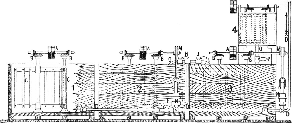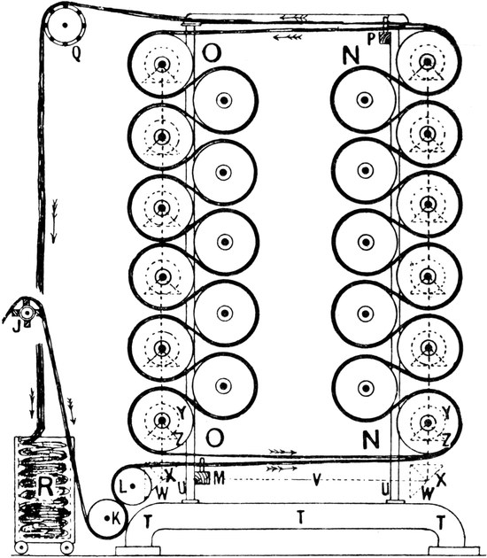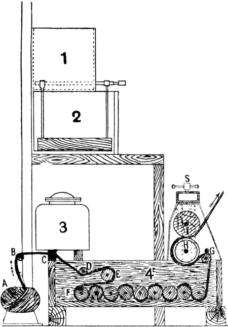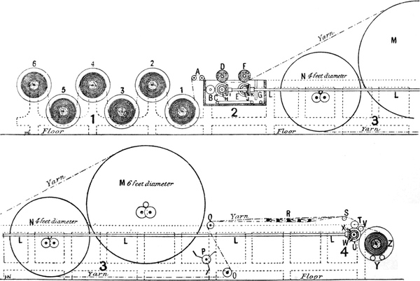 The series of operations in this system are identical with those involved in the preparation of grey warps by means of[Pg 4] ball warping, but with the additional process of dyeing immediately following the operation of warping, and are as follows:—