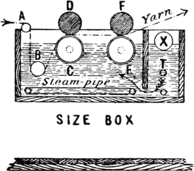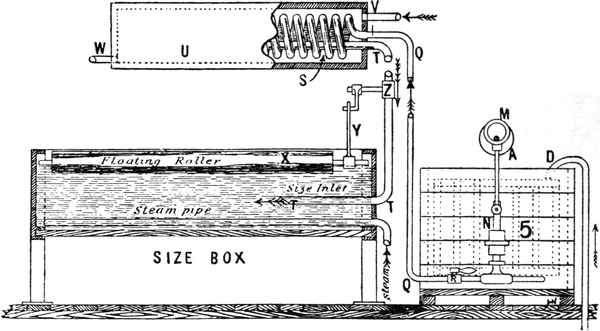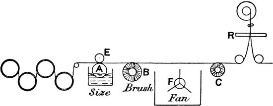 3. Slasher or tape sizing, whereby yarn is withdrawn from several beams, termed “back” or “slashers’” beams, to be sized, and subsequently re-wound by the same machine on to a weaver’s beam by simultaneous operations.
