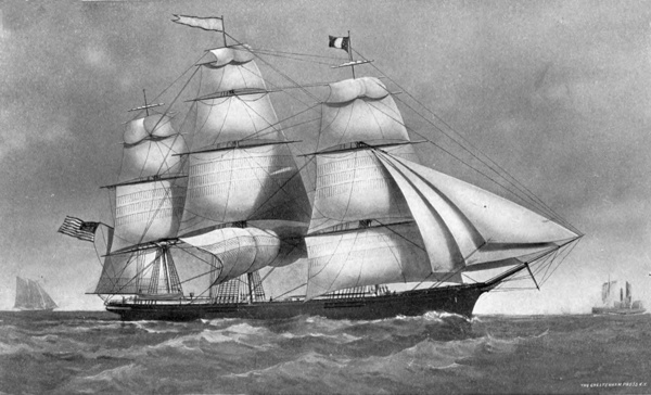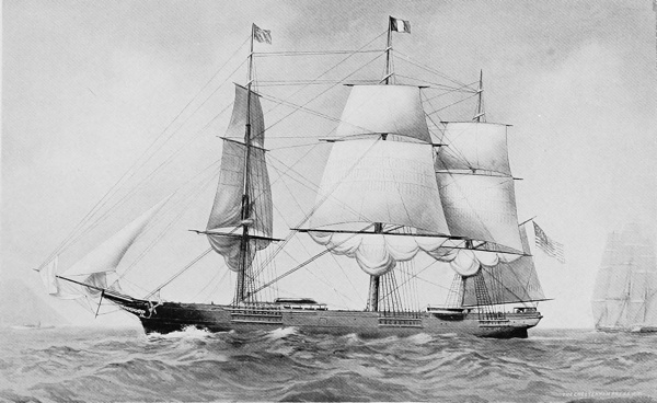At the same time, that is, in the decade following the peace of 1815, a new element of ocean commerce came into being. This was the inauguration of regular packet-lines. The pioneer of this enterprise on any considerable scale was the famous “Cope Line,” founded by Thomas P. Cope in 1820, and employing at first five ships which were among the largest and best vessels then afloat. This line continued to run until the Civil War. Its ships were from five hundred and sixty to one thousand two hundred and eighty tons. They sailed from Philadelphia the 20th of each month and from Liverpool the 8th, their trip-time averaging thirty days and being almost as regular as the modern steamship lines. In addition to this regular monthly service, extra ships were frequently despatched as the exigencies of trade and travel might require.