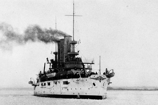 “At the beginning of that war, Japan, though possessing a very respectable force of cruisers and gunboats, mostly of modern types and advanced design, had no armored ships worthy of the name. The old ‘Stonewall’ had been broken up, the ‘Fu-So,’ the ‘Riojo,’ the ‘Heiyei,’ and the ‘Kon-Go,’ built from 1865 to 1877, were obsolete, and the ‘Chiyoda,’ the only one of modern design and armament, was a small armored cruiser of 2450 tons, with a 4½-inch belt, and no guns larger than 4.7-inch caliber.