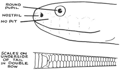 1. HOG-NOSED SNAKE. Length 2-2½ feet. This is the “blow viper,” “spreadhead viper,” “spreading adder,” or other equally ill-named snake usually found in dry sandy areas. It has a threatening defensive bluff which consists of spreading the fore part of the body cobra-like, hissing and striking (but with mouth closed). Failing to intimidate its opponent, the snake will contort its body convulsively and roll onto its back—apparently dead. It will remain inert unless rolled over onto its stomach; then it will roll onto its back again—the only proper attitude for a dead snake!