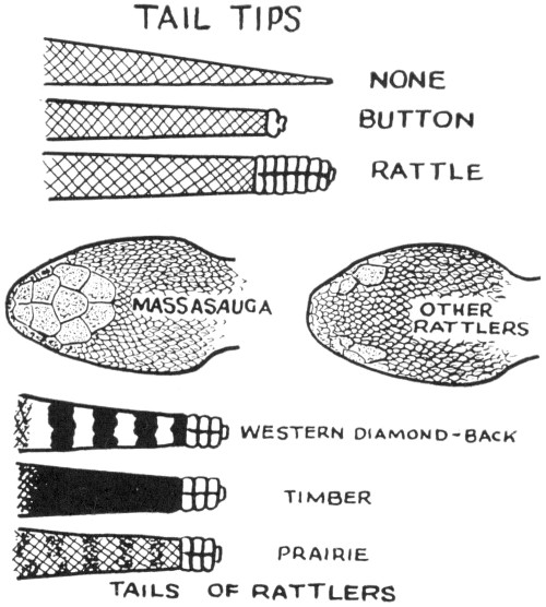 PRAIRIE RATTLESNAKE (Crotalus viridis). Length 3-4 feet. This rattlesnake is common in western Kansas, where it frequents rocky open regions, grassy prairies, and agricultural areas. In eastern Kansas it has been found only in the Pittsburg vicinity, and any “prairie rattler” east of Wichita or Manhattan is usually the massasauga. The habit of denning in large groups is well-known. Several hundred have been found in hibernation in a single den. The food of the prairie rattler is warm-blooded, mostly rodents and small rabbits. It appears to be active in the daytime, whereas the other poisonous snakes are mainly nocturnal. The ground color varies from a light gray to green, and the pattern of dorsal blotches with alternating rows of lateral blotches may cause it to be confused with the smaller massasauga, but the scales on top of the head are all small on the prairie rattler, whereas paired plates are present on the massasauga (see diagram, page 6).