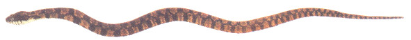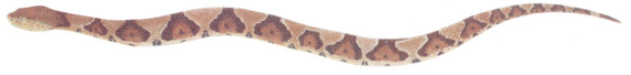 COPPERHEAD (Agkistrodon contortrix). Length usually 2-3 feet. Common where it occurs, the copperhead is probably the most abundant poisonous snake in eastern Kansas. It is most frequently found in the vicinity of rocky ledges in oak-hickory-walnut woods, but it ranges widely, so that individuals may be found in almost any habitat during summer months. Although generally nocturnal during most of its active season, its habit of lying in the open during the daytime among dried leaves in patches of sunlight and shadow causes the pattern to blend perfectly with the background. Any hiker through this habitat should be alert. Because of the rather small size, usually inoffensive disposition, and the low toxicity of its venom this snake should be placed on the non-fatal list for adults. Elderly persons, those in poor health, or small children could find the copperhead bite fatal, however.