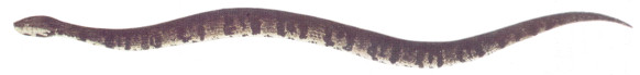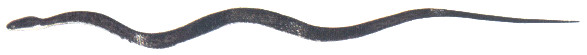 3. COMMON WATER SNAKE. Length 2-3 feet. This snake and the yellow-bellied water snake, of very similar appearance, are the most often noted snakes along creeks, rivers, lakes, and ponds. These are usually the “moccasins” that frighten persons near water. Entirely harmless, but with a vicious disposition, these snakes feed upon small fish, frogs, and other creatures that inhabit their neighborhood.