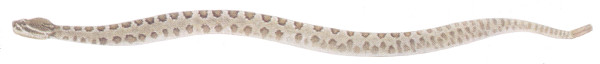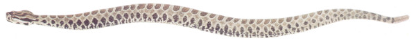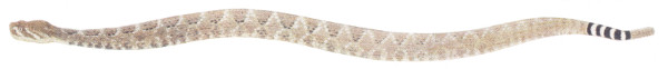WESTERN DIAMOND-BACKED RATTLESNAKE (Crotalus atrox). Length 4-5 feet, although some are larger. In the United States, probably more deaths are caused by this snake than by any other. A combination of large size, wide distribution, abundance, and touchy temperament give this distinction to this snake. It is hardly a member of the Kansas snake fauna, having been found only twice in the state, both times in the southeastern corner. It should occur, although presently unrecorded, in south-central Kansas along the Oklahoma line. It is rather common in Oklahoma, just south of this region. The diamond-back prefers dry open plains and canyons, where it feeds upon small rodents, young rabbits, and occasionally, birds. The ground color varies somewhat from buff to gray; the snake generally has a faded appearance. The black and white tail bands are distinctive.