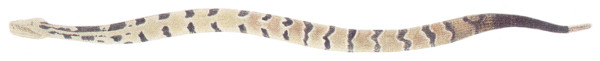 TIMBER RATTLESNAKE (Crotalus horridus). Length 3-4 feet, occasionally longer. The timber rattler occurs only in eastern Kansas and is only locally common, at scattered localities. It prefers the deciduous forest where limestone rock outcrops as ledges, but may wander into cultivated fields and open areas during late spring and summer. The food consists primarily of small rodents and young rabbits. Ordinarily, it is a mild-mannered snake, one which will seek to escape direct contact with man, but its size and habit of living close to human habitations necessitate considering this rattler dangerous. Ground color may vary from a light gray to yellow, with the black chevron-shaped blotches of the back uniting with lateral blotches to form crossbands. Another common name for the timber rattler is banded rattlesnake. Some individuals may be almost all black. The tail is characteristically velvet black in adults; banded in young.
