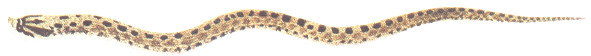 MASSASAUGA (Sistrurus catenatus). Length 24-27 inches. This snake belongs to a group of small rattlesnakes called “ground” or “pygmy” rattlers, which are differentiated from the larger rattlers by having paired scales on top of the head, as have the copperhead, cottonmouth, and non-poisonous snakes. The massasauga occurs in open fields and rocky outcroppings. It is particularly common in the Flint Hills. This is the “prairie rattler” of eastern Kansas, often found under hay bales in fields. Its food consists primarily of small rodents. The small size and usually docile disposition of this snake tend to place it upon the non-dangerous list, but its venom is extremely toxic, and any bite from a poisonous snake is dangerous. When aroused, these small snakes strike with a fury not seen in the larger snakes. The rattling of this small snake is hardly louder than the buzz of a grasshopper.