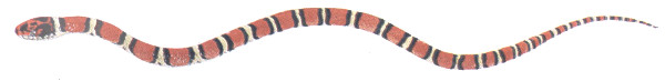 6. RED MILK SNAKE. Length 2-3 feet. A beautiful jewel of a snake, this small creature has been credited with the ability to milk a cow dry! Such a feat is impossible for a number of reasons. This reputation was acquired because this snake was frequently found in barns, where it had gone in search of mice, a favorite food item. The color pattern might be confused with that of the poisonous coral snake (not found in Kansas). In the coral snake, however, the red and yellow rings are adjacent.