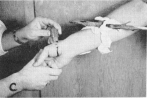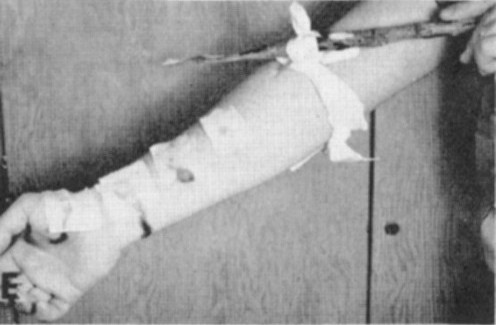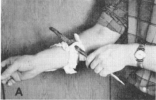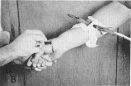 1. Place tourniquet between bite and body. Use handkerchief, tie, or any other handy cloth. Tie loosely around arm, place stick in slack part and twist. (Fig. A) Tourniquet should not be too tight. Should be able to push finger under it. Loosen for a minute every 15 minutes. If bitten on hand or lower arm, be sure to remove any rings, bracelets, or watches.
