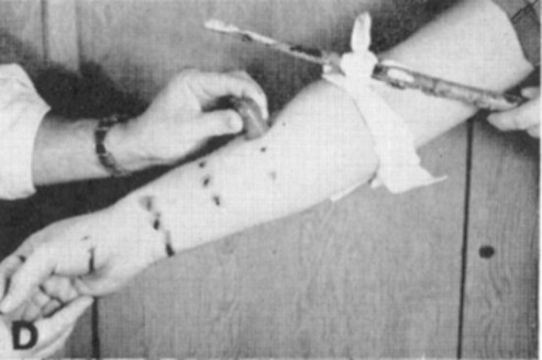 4. As swelling progresses up limb, tourniquet should be moved ahead of swelling and additional cuts and suction should be made at edge of swelling. (Fig. D).