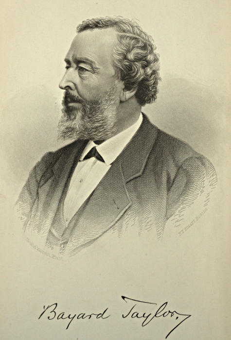 “Thirty-two years ago, on a bright spring morning, a[350] young man of twenty-three held out his hand to me, and introduced himself as Bayard Taylor. We had corresponded at intervals since his first little volume was published in 1844, but we had never met until then. He had come to Boston, rather unexpectedly, he said, to see Longfellow, and Holmes, and Whipple, and some others, who had expressed an interest in his ‘Views Afoot,’ then recently printed in book-form. No one could possibly look upon the manly young fellow at that time without loving him. He was tall and slight, with the bloom of youth mantling a face full of eager, joyous expectation. Health of that buoyant nature which betokens delight in existence, was visible in every feature of the youthful traveller.
