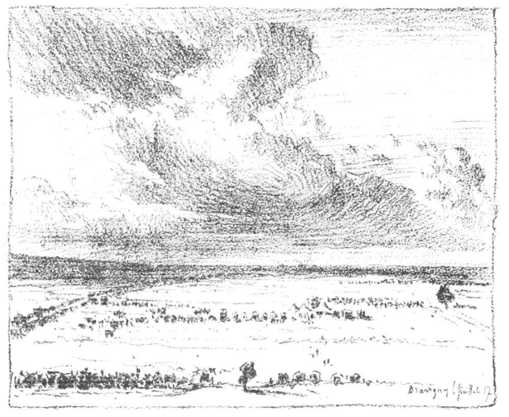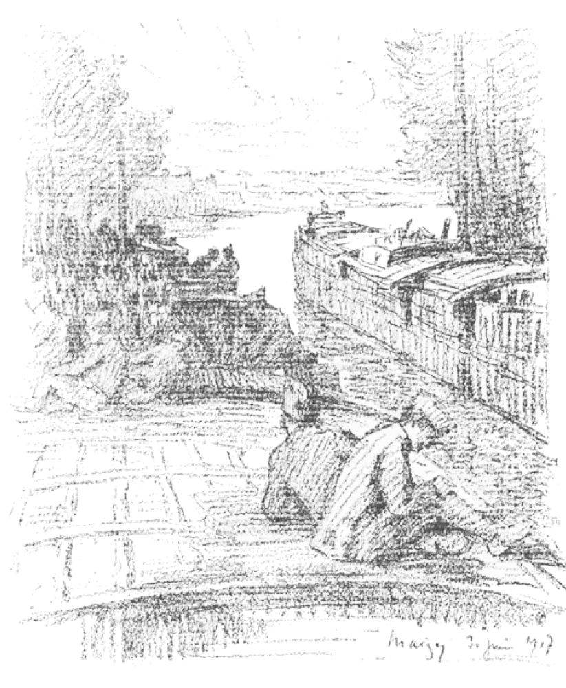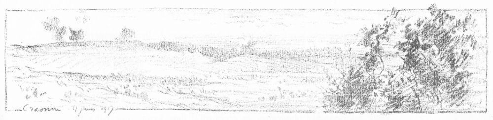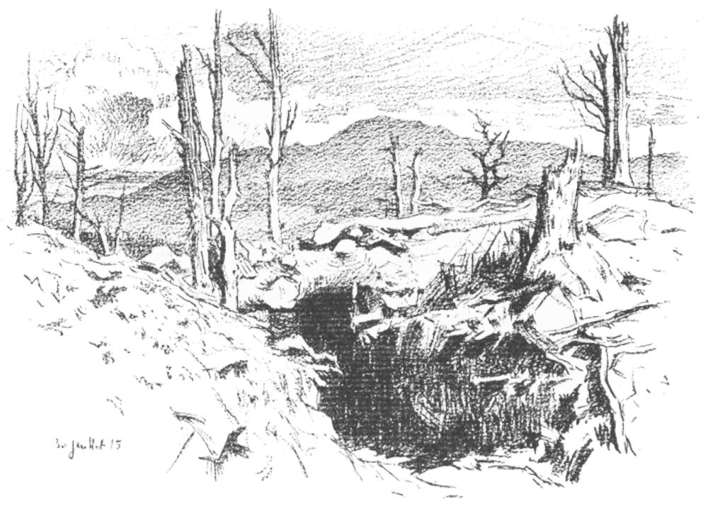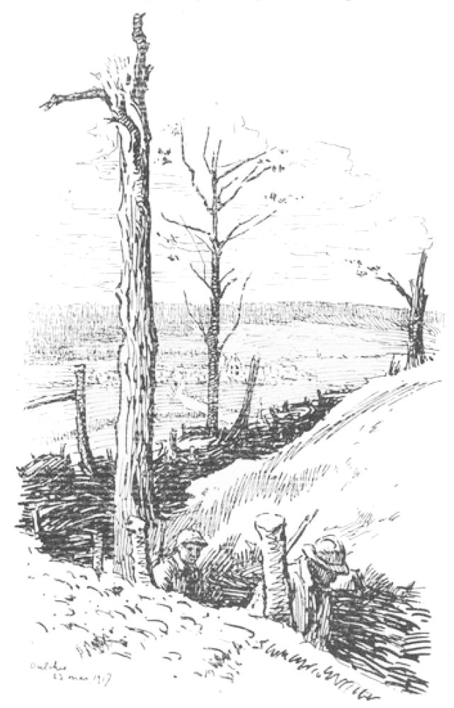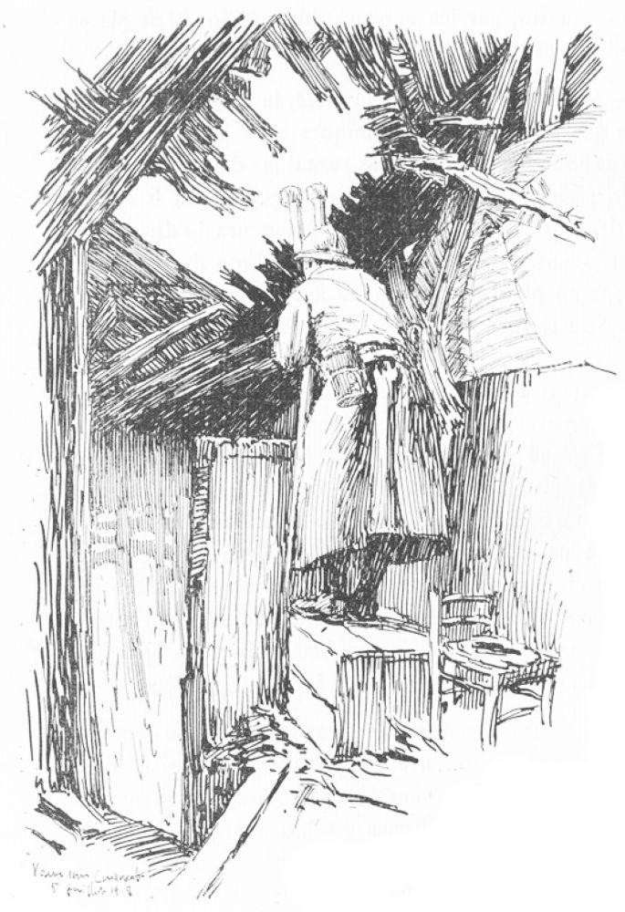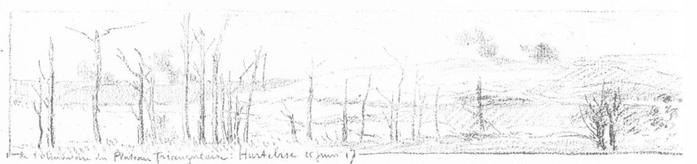Je n’oublierai jamais qu’en arrivant à l’Hartmann, quand, pour me présenter au P. C. du bataillon, je dévalais le Boyau Central le cœur un peu serré par sa solitude menaçante—on ne le fréquentait guère par plaisir, et pour cause,—le premier, le seul camarade, que j’aie alors rencontré, c’était un chasseur de la brigade, adossé à{5} un pare-éclats; on l’avait envoyé relever un tracé des travaux, et, abandonnant sa planchette de topographe, tranquillement, ne me voyant même pas venir, il s’absorbait à peindre sur son bloc-notes une aquarelle.