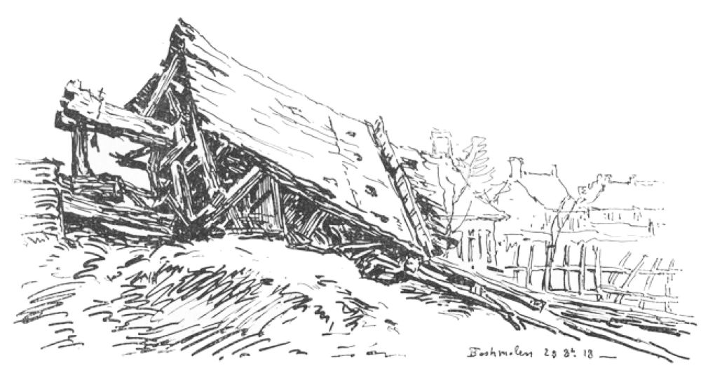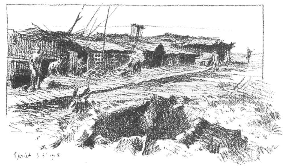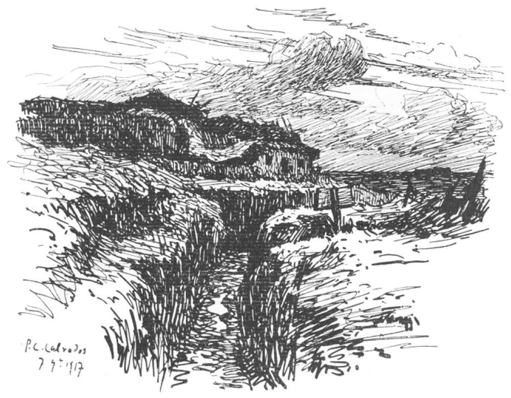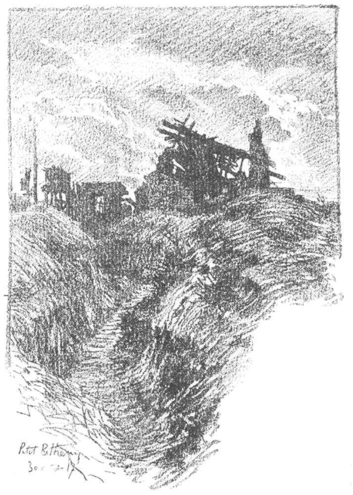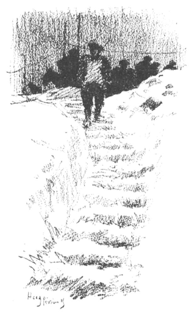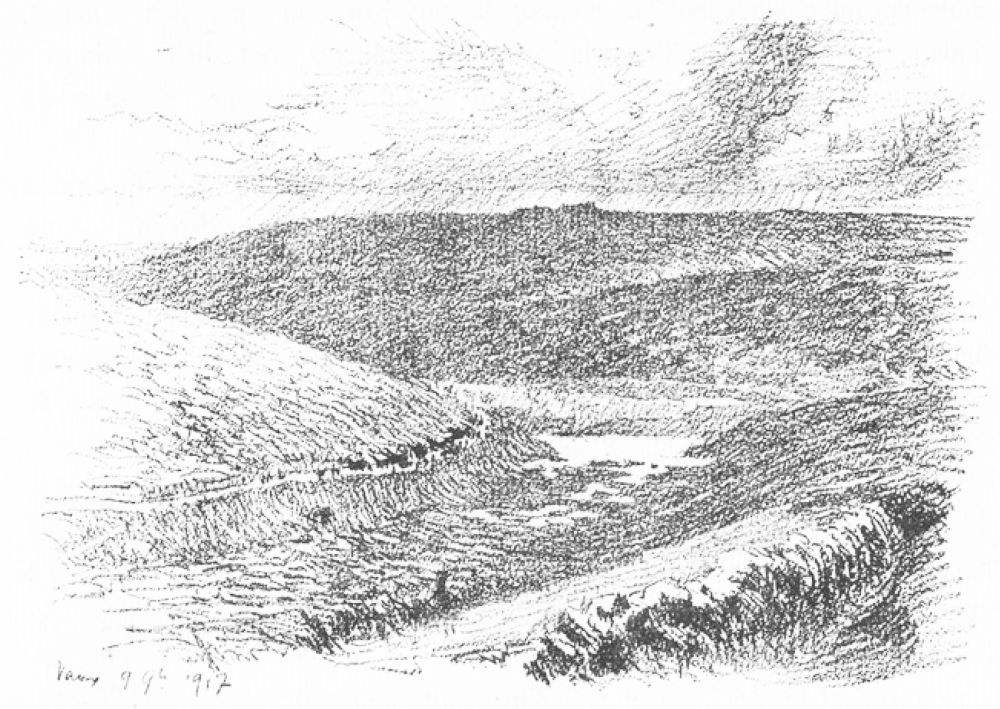 Je n’oublierai jamais qu’en arrivant à l’Hartmann, quand, pour me présenter au P. C. du bataillon, je dévalais le Boyau Central le cœur un peu serré par sa solitude menaçante—on ne le fréquentait guère par plaisir, et pour cause,—le premier, le seul camarade, que j’aie alors rencontré, c’était un chasseur de la brigade, adossé à{5} un pare-éclats; on l’avait envoyé relever un tracé des travaux, et, abandonnant sa planchette de topographe, tranquillement, ne me voyant même pas venir, il s’absorbait à peindre sur son bloc-notes une aquarelle.