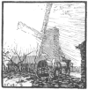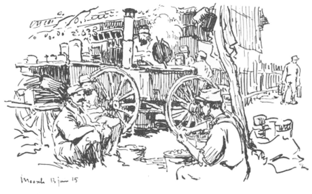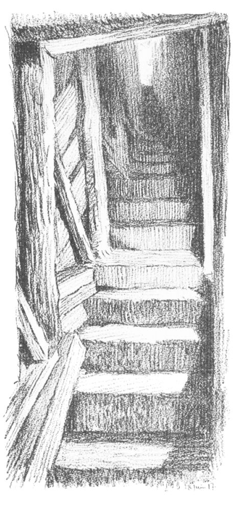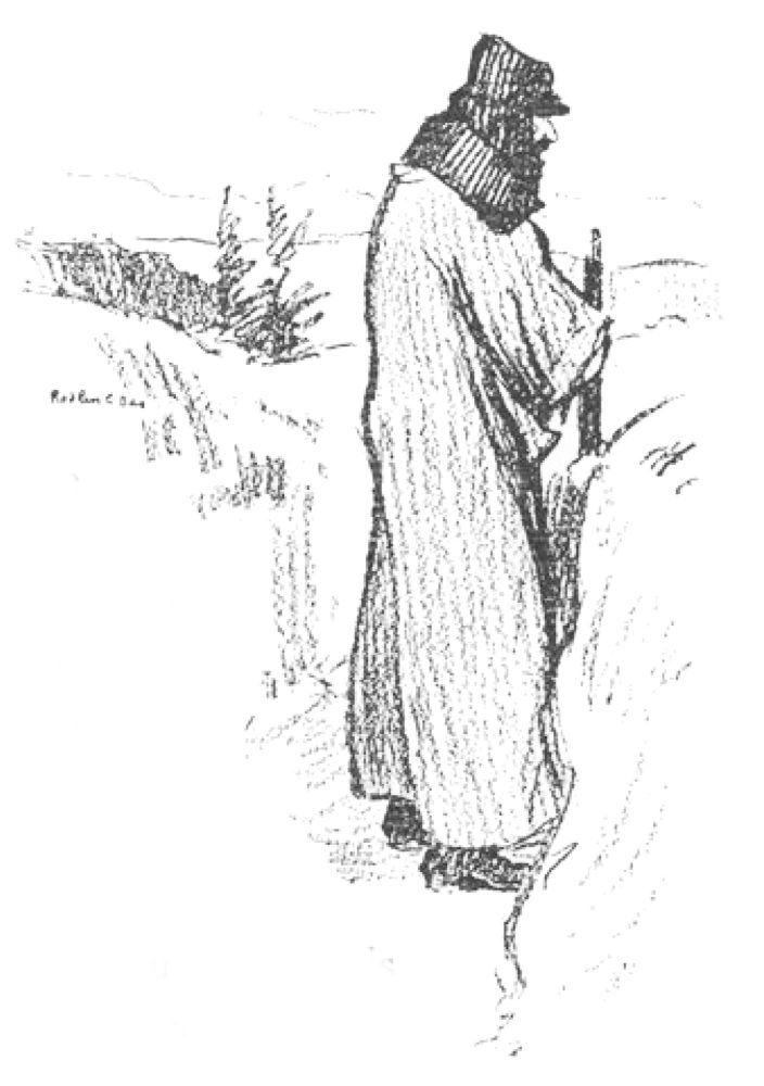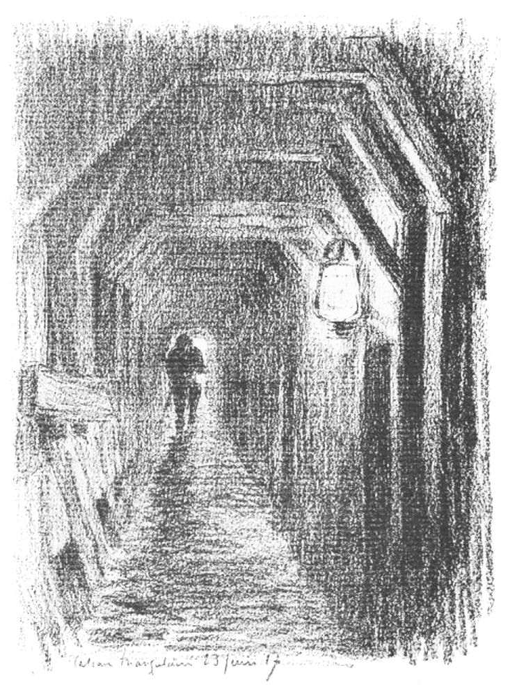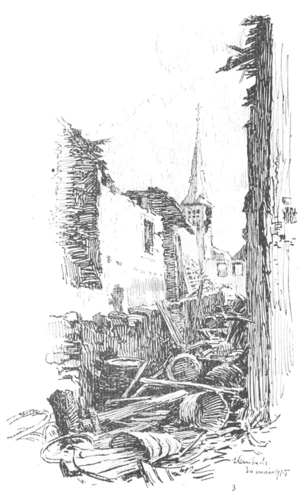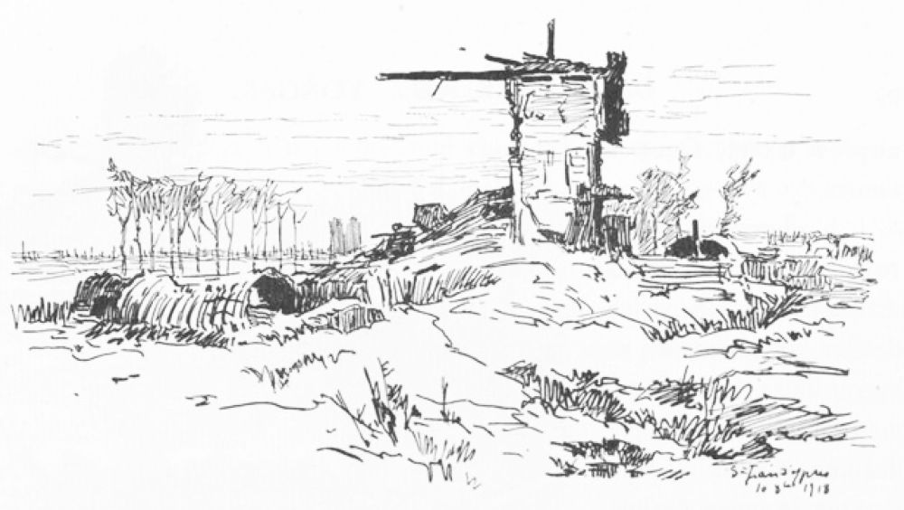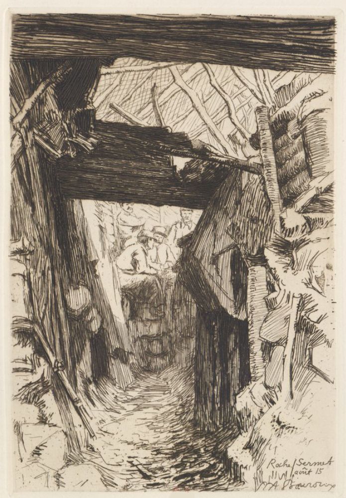 Je n’oublierai jamais qu’en arrivant à l’Hartmann, quand, pour me présenter au P. C. du bataillon, je dévalais le Boyau Central le cœur un peu serré par sa solitude menaçante—on ne le fréquentait guère par plaisir, et pour cause,—le premier, le seul camarade, que j’aie alors rencontré, c’était un chasseur de la brigade, adossé à{5} un pare-éclats; on l’avait envoyé relever un tracé des travaux, et, abandonnant sa planchette de topographe, tranquillement, ne me voyant même pas venir, il s’absorbait à peindre sur son bloc-notes une aquarelle.