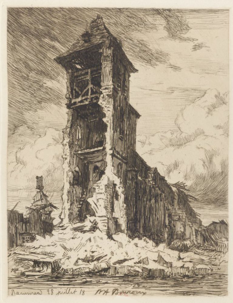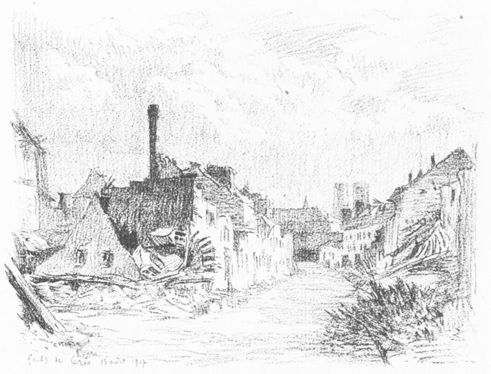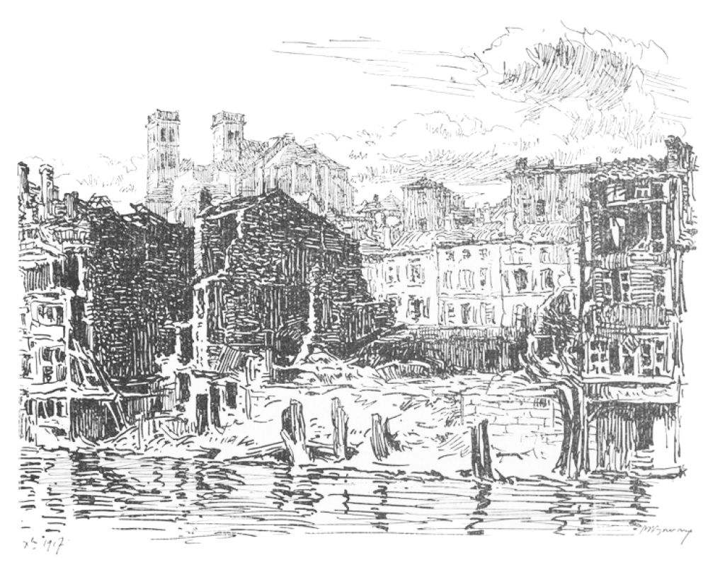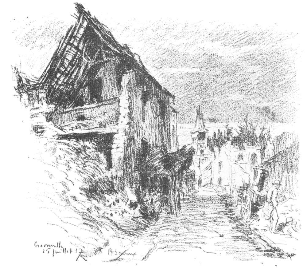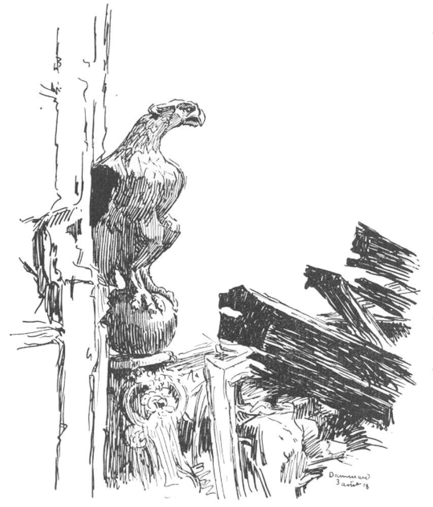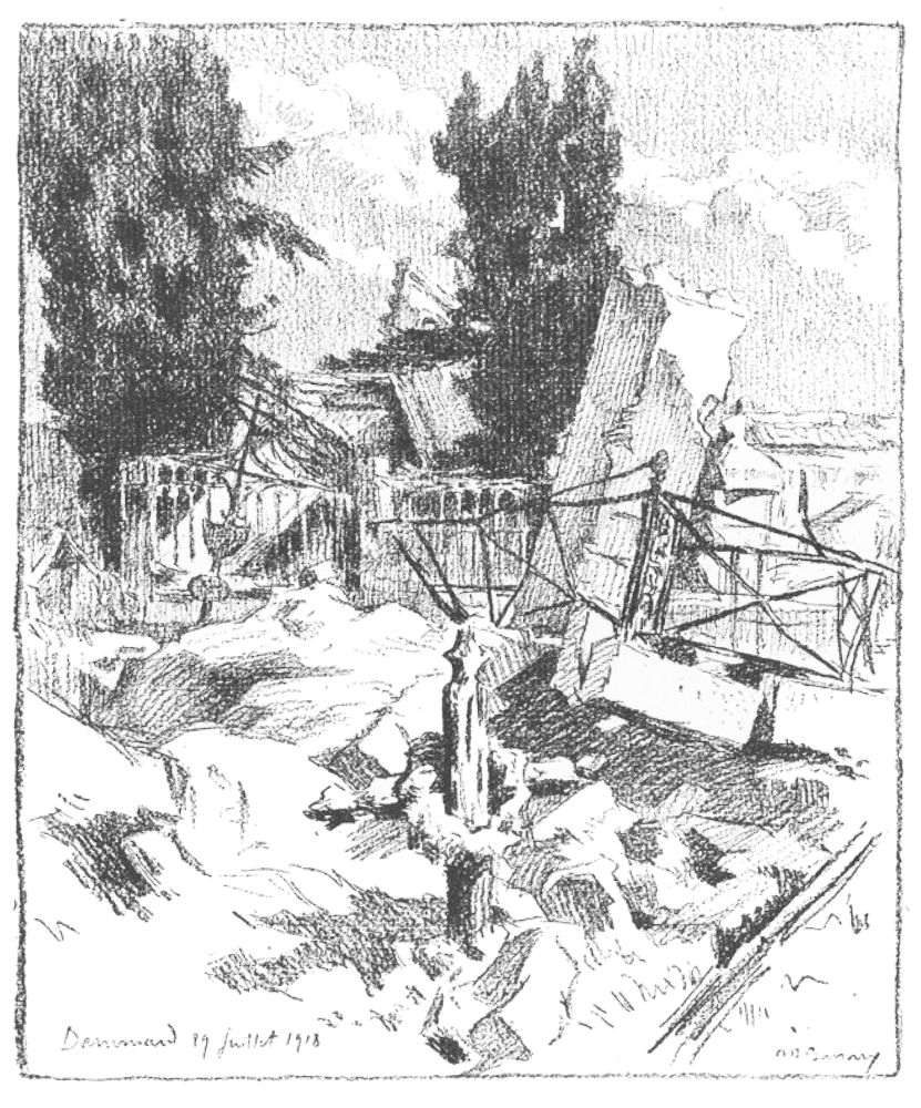 La guerre n’est qu’une convulsion, qui bouleverse les êtres et les choses, mais une convulsion ne dure pas. A la place des ruines, dont le burin du graveur trace la figure pathétique, d’autres édifices s’élèveront un jour à nouveau. Et devant même que d’autres pierres aient remplacé les pierres détruites, la nature la première n’a-t-elle pas rétabli son harmonie éternelle, comblant les tranchées et les trous d’obus? Les champs de désolation et de mort ne s’apprêtent-ils pas pour les moissons de demain?