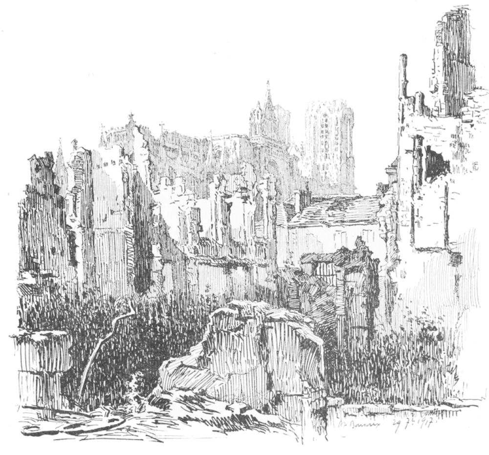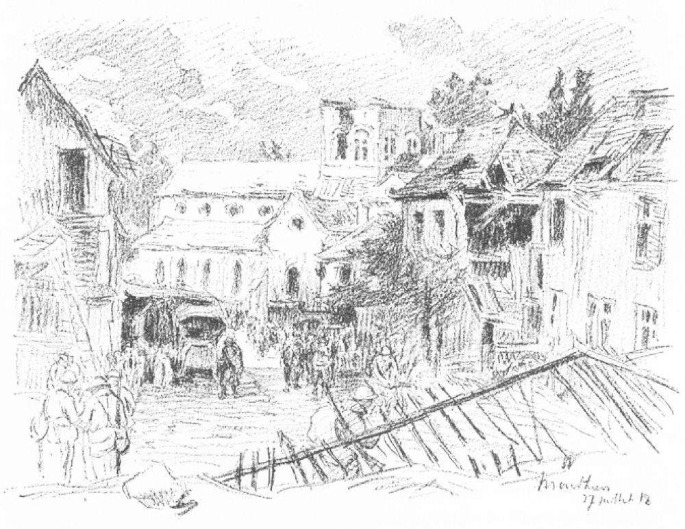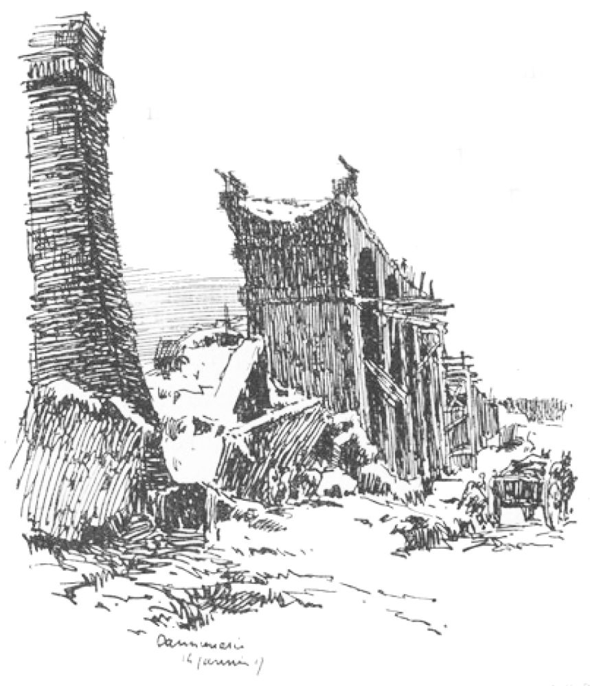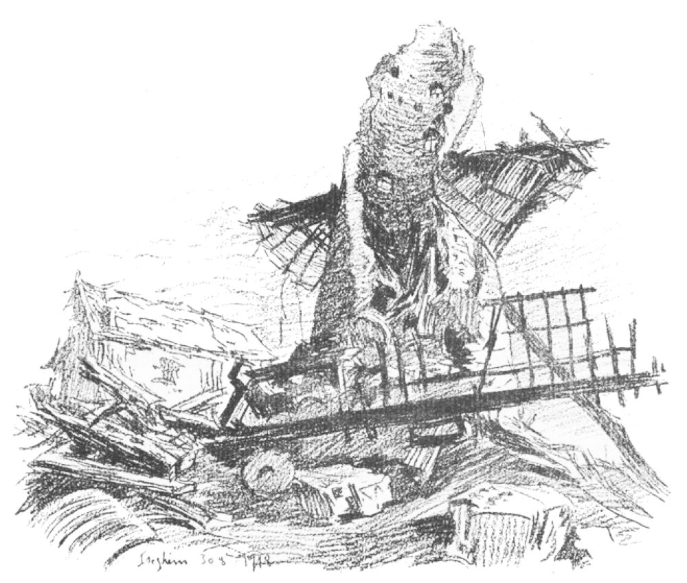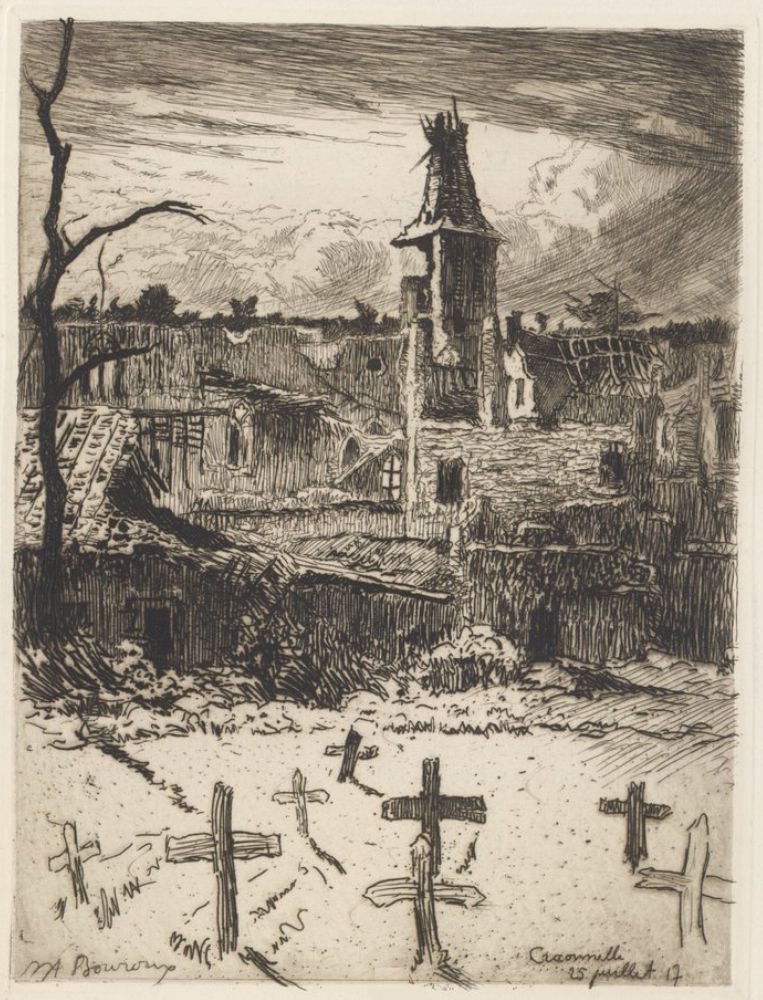 La guerre n’est qu’une convulsion, qui bouleverse les êtres et les choses, mais une convulsion ne dure pas. A la place des ruines, dont le burin du graveur trace la figure pathétique, d’autres édifices s’élèveront un jour à nouveau. Et devant même que d’autres pierres aient remplacé les pierres détruites, la nature la première n’a-t-elle pas rétabli son harmonie éternelle, comblant les tranchées et les trous d’obus? Les champs de désolation et de mort ne s’apprêtent-ils pas pour les moissons de demain?