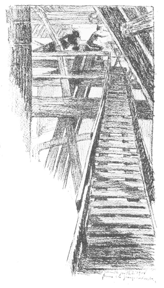 Des ouvriers «civils» travaillent à la route en lacets qui, remplaçant les sentiers muletiers, permet l’accès, presque jusqu’au sommet, des lourds convois du ravitaillement et de l’artillerie. Parmi ces civils, il en est de tout jeunes, qui se sont coiffés de bérets d’alpins, et dont les bonnes joues roses et rondes me rappellent mes petits garçons.