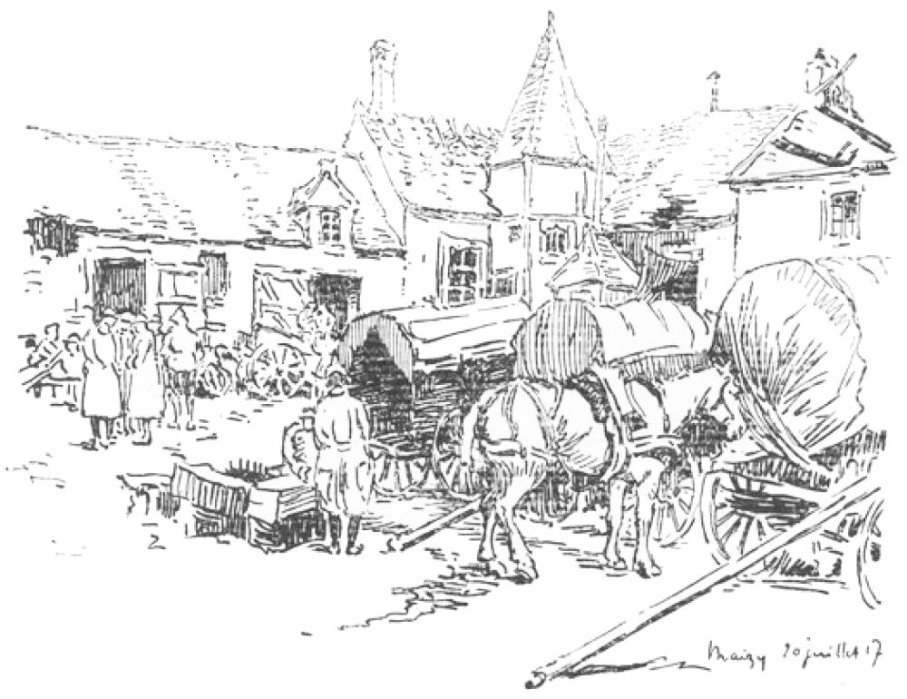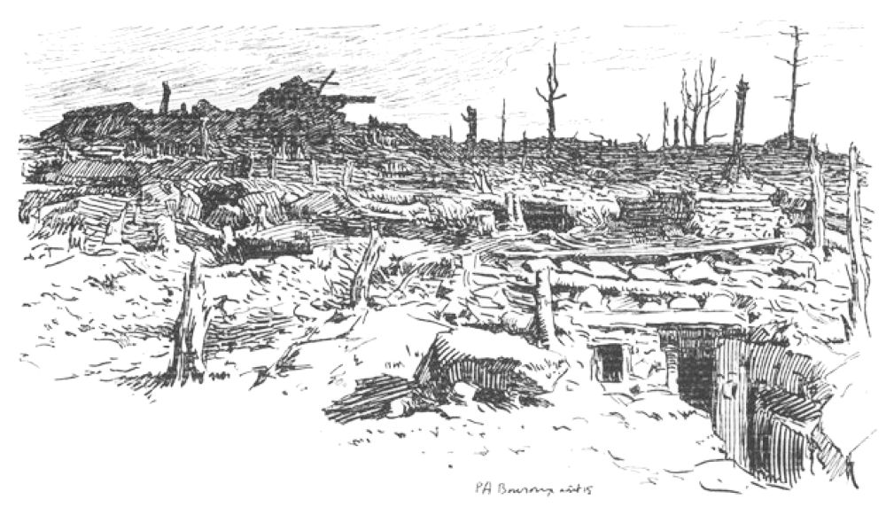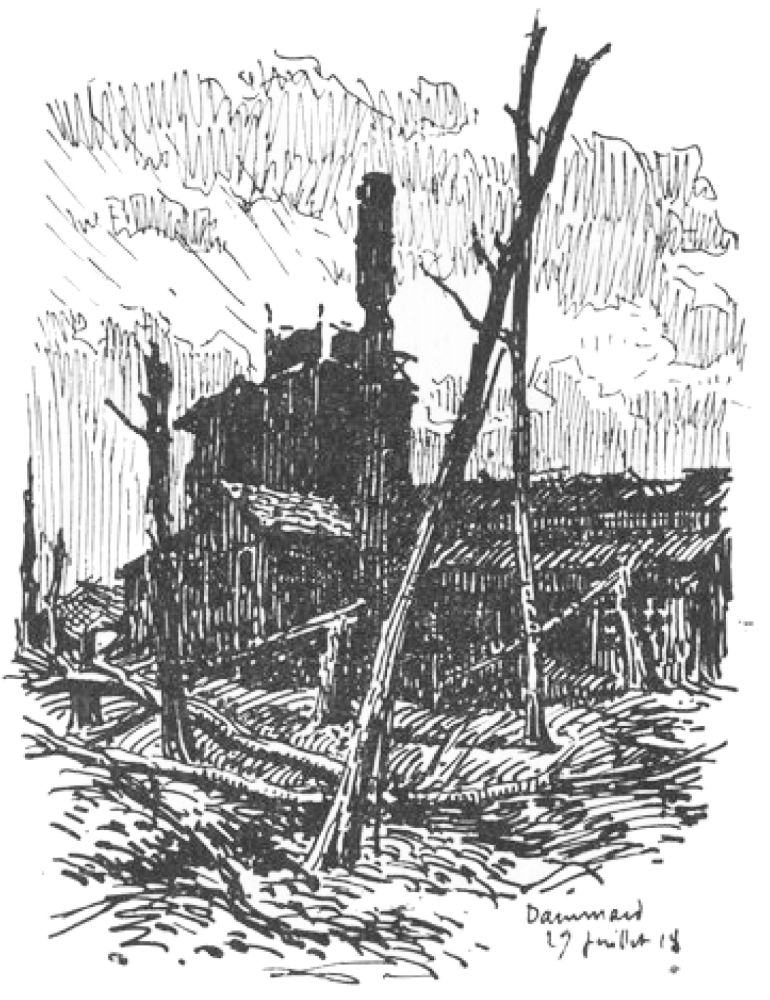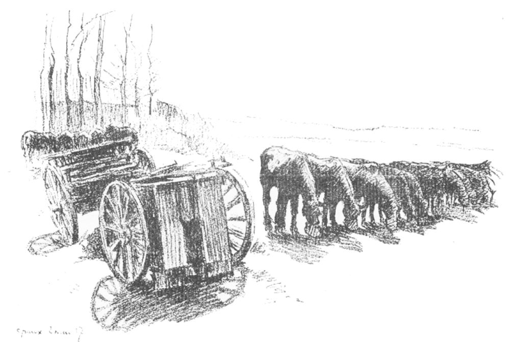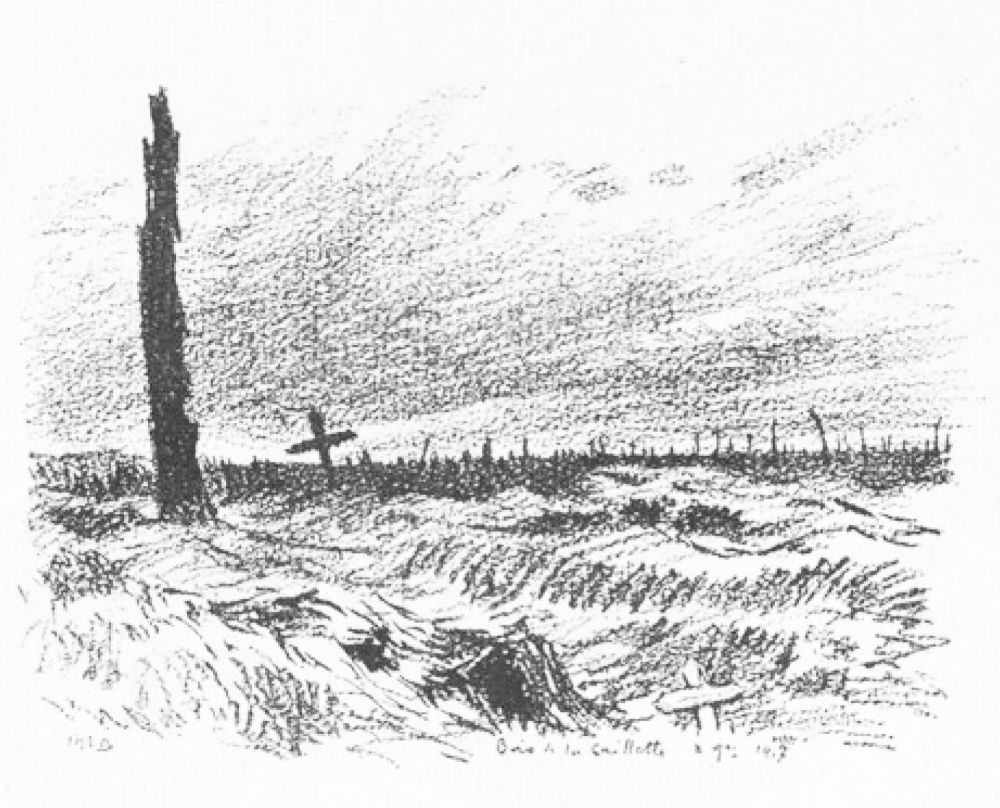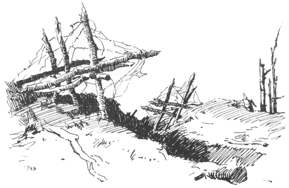 Cependant les sapins qui, jusqu’ici, m’avaient protégé de leur ombre majestueuse et bleue se font plus rares; aux taillis naturels succèdent des buissons de fil de fer barbelé. Des éclatements se précisent, plus rapprochés, plus nets... A un tournant, une intolérable odeur de bêtes en décomposition—des mulets ont été éventrés par une rafale «bien placée».