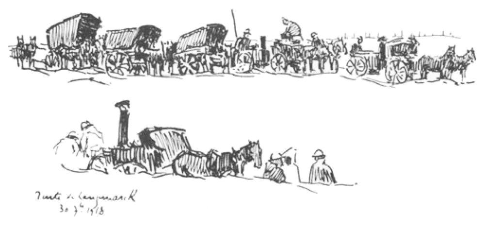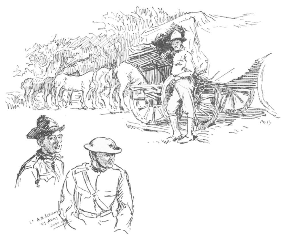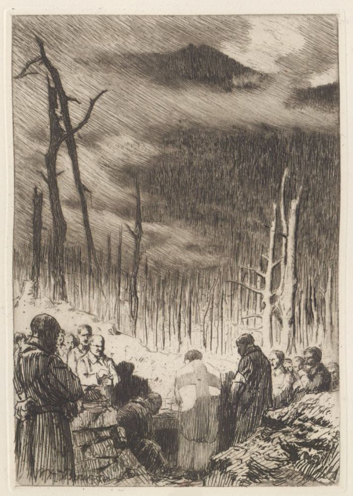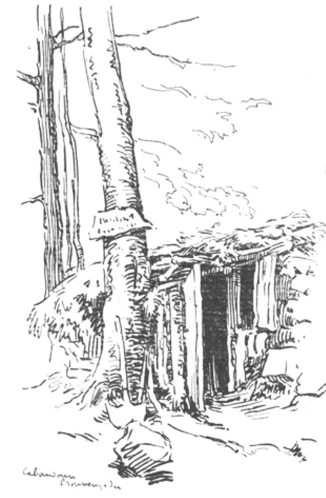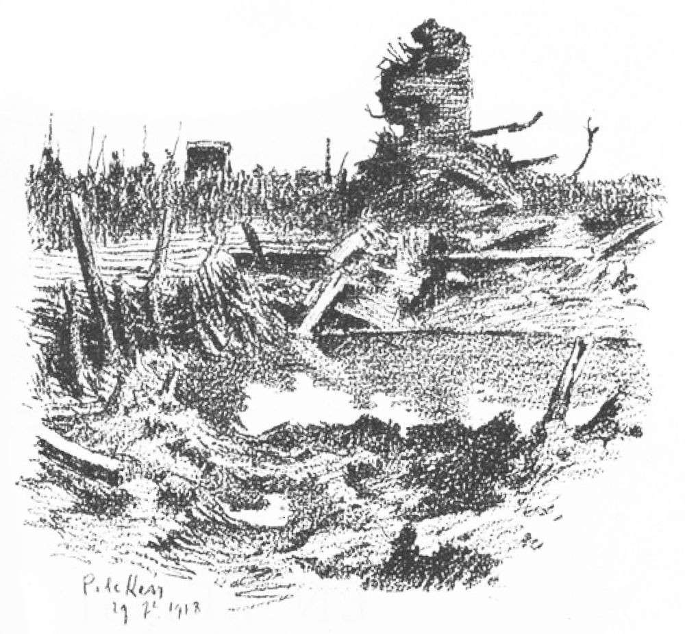 Cependant les sapins qui, jusqu’ici, m’avaient protégé de leur ombre majestueuse et bleue se font plus rares; aux taillis naturels succèdent des buissons de fil de fer barbelé. Des éclatements se précisent, plus rapprochés, plus nets... A un tournant, une intolérable odeur de bêtes en décomposition—des mulets ont été éventrés par une rafale «bien placée».
