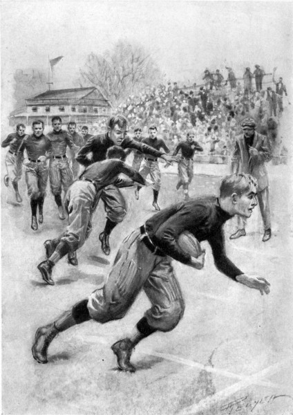 Gould dropped back into kicking position, but when the ball went to him he poised it and waited to find his end to make a forward pass. Jim, hurling himself past his opponent, dodged a half-back and before Gould could get the ball away, was upon him. Down went the little quarter and away bobbed the ball. An instant of wild scrambling and then Jim was on his feet again, the ball was scooped up into his arms and he was off with a clear field ahead. After him came the pursuit, foe and friend alike trailing backward along the gridiron. Past the middle of the field, and still well ahead, Jim dared turn in toward the center of the middle of the field. Then Gould, making what was his pluckiest effort of all that long, hard-fought game, almost reached him. But behind Gould was Gil, and Gil it was who, just as the quarter-back’s[338] arms stretched out to bring Jim to earth, threw himself in front of the enemy. Over they went together, rolling and kicking, and Jim, with his breath almost gone, staggered and fell across the goal line.