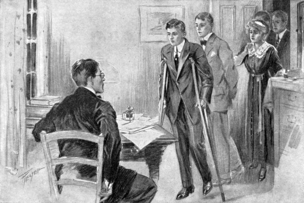 Jeffrey seized his crutches and hobbled quickly away, while Mr. Hanks and Jim left their seats and disappeared behind the throng. At that minute the Crofton team trotted back on to the field and the cheering began again.