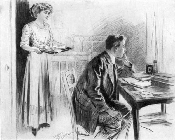 “I wonder if a fellow has more fun living in the village,” mused Poke. “Of course it’s nice being in hall when you know there are loads of[15] chaps envying you your room, but, after all, we don’t have much chance for larks, what with study hour, and being in at ten, and all that. I believe I’d like to try a house next year, Gil.”