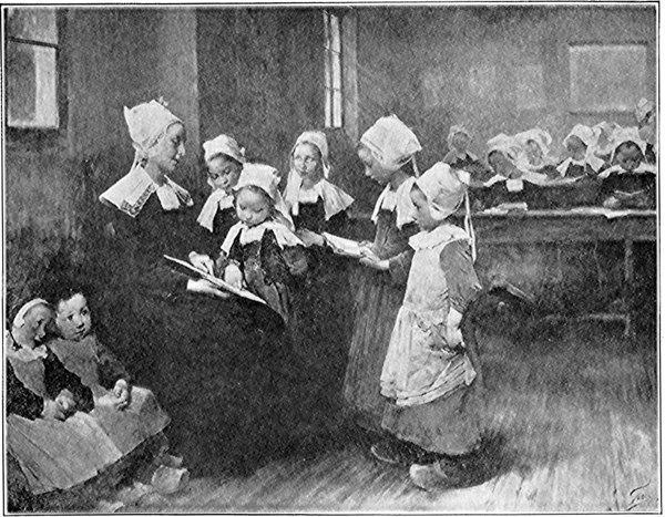 And what will the children play? They probably do not have toboggan slides, seesaws, swings, or basket-balls on their playgrounds, but no doubt they play games like our “Follow the Leader,” “London Bridge,” “Crack the Whip,” and other games we like to play. It does not seem as if they could run very fast in such clumsy wooden shoes. If you have ever tried 17to wear a pair of Dutch wooden shoes you will wonder how they could be worn in school, for they are very likely to make a great deal of noise on the wooden floor. But you can tell by looking at this picture that all is very quiet in the schoolroom.