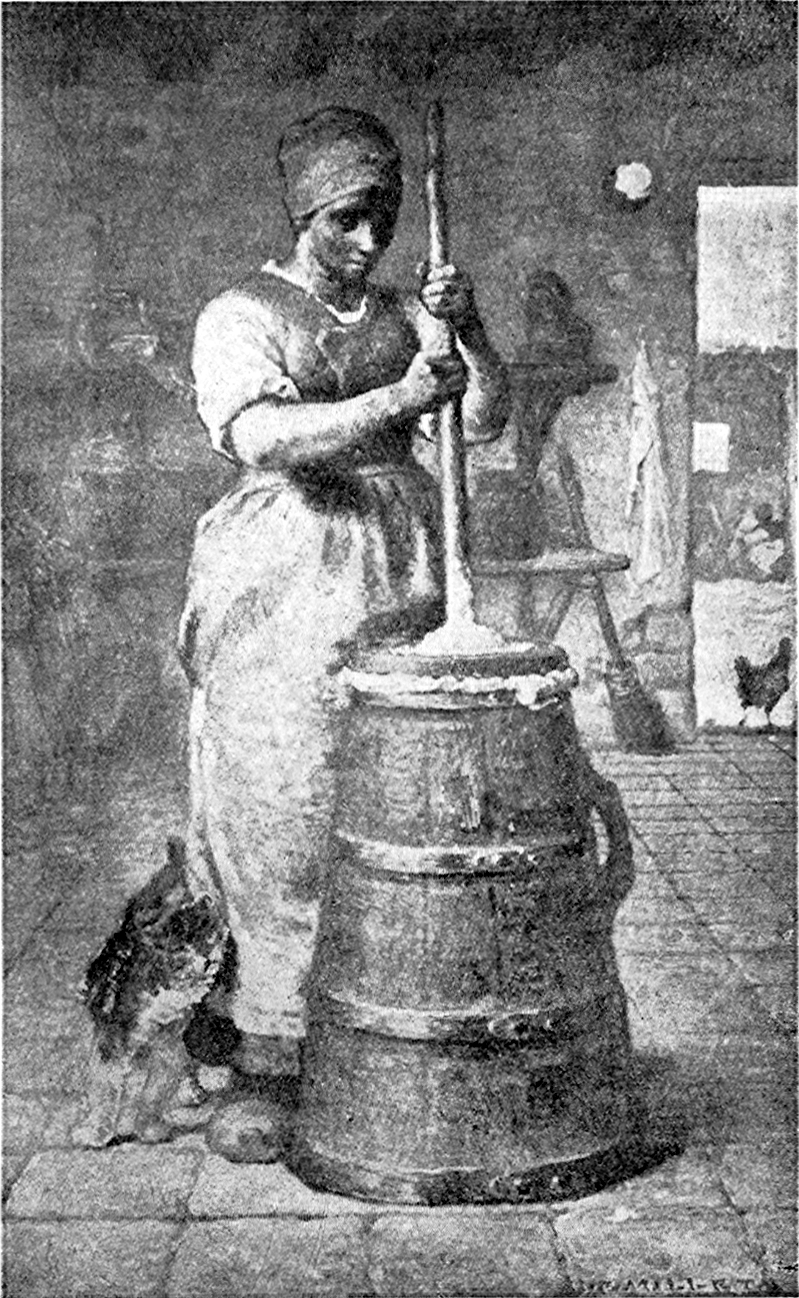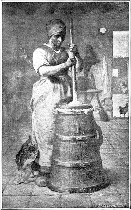 The story of the picture. When the artist, Jean François Millet, was a little boy he lived in the country where nearly all the people knew how to churn and make their own butter. No doubt he often watched his grandmother churn and helped her, too. He must have liked to see her pour the milk into the big pans, which she then set away in a cool place until all the cream had come to the top. Then she would skim the cream from the milk, put it 22into the big wooden churn, and begin to work the churning rod up and down, up and down, until her arms grew so tired that she was glad to rest them a while and let him churn.