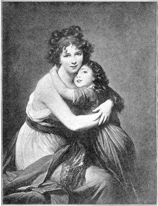 38Madame Lebrun had been planning for some time perhaps to paint a portrait of herself. Then, just as she was all ready and seated in front of a long mirror, the door had opened suddenly and in had come her little daughter. With a hop and a jump she had thrown herself into her mother’s arms. Then with her arms still about her mother’s neck, she had happened to think of the mirror, and half turning there she had seen herself held close in her mother’s embrace. Madame Lebrun realized at once what a lovely picture it would make, and so she began to paint it.