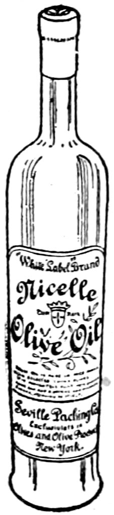 Miss Farmer’s School of Cookery, 30 Huntington Avenue, Boston, Mass. Seville Packing Co., New York. Gentlemen,—After repeated trials in the use of Nicelle Olive Oil, I find it always maintains the same high standard, therefore I feel to recommend it as a superior product. Yours very truly, Fannie Merritt Farmer. |