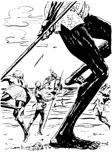 But the runabout came toward them on the heaving surf. Before the chief could raise his hand a second time, the corporal stood up in the prow of the runabout and fired a blaster toward the beach. He had fired it high and he waited for it to disperse the spearmen. When it did not, he fired again, lower. The chief lifted his hand and brought it down. A volley of spears leaped from muscular arms, arching in the sunlight, dropping toward the runabout....