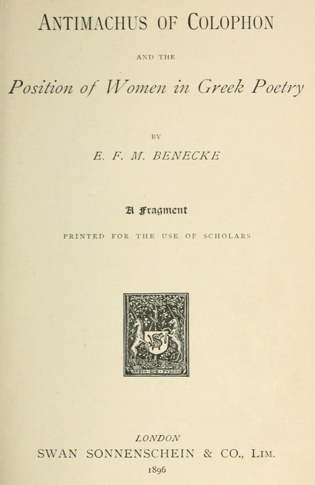 This phenomenon has been noticed before—indeed, it is one that could not very well escape notice—though its true importance has not always been appreciated; and the general consensus of opinion has agreed to ascribe this great change, the greatest change perhaps that has ever come over art, to the influence of two men, Euripides and Menander. My object in writing now is to endeavour to show, firstly, that this general view is a mistaken one, arising from an insufficient appreciation of the true nature of the change; and secondly, that the real originator of that new feeling which we encounter in Alexandrian literature,—in other words, the first man who had the courage to say that a woman is worth loving,—was Antimachus of Colophon.
