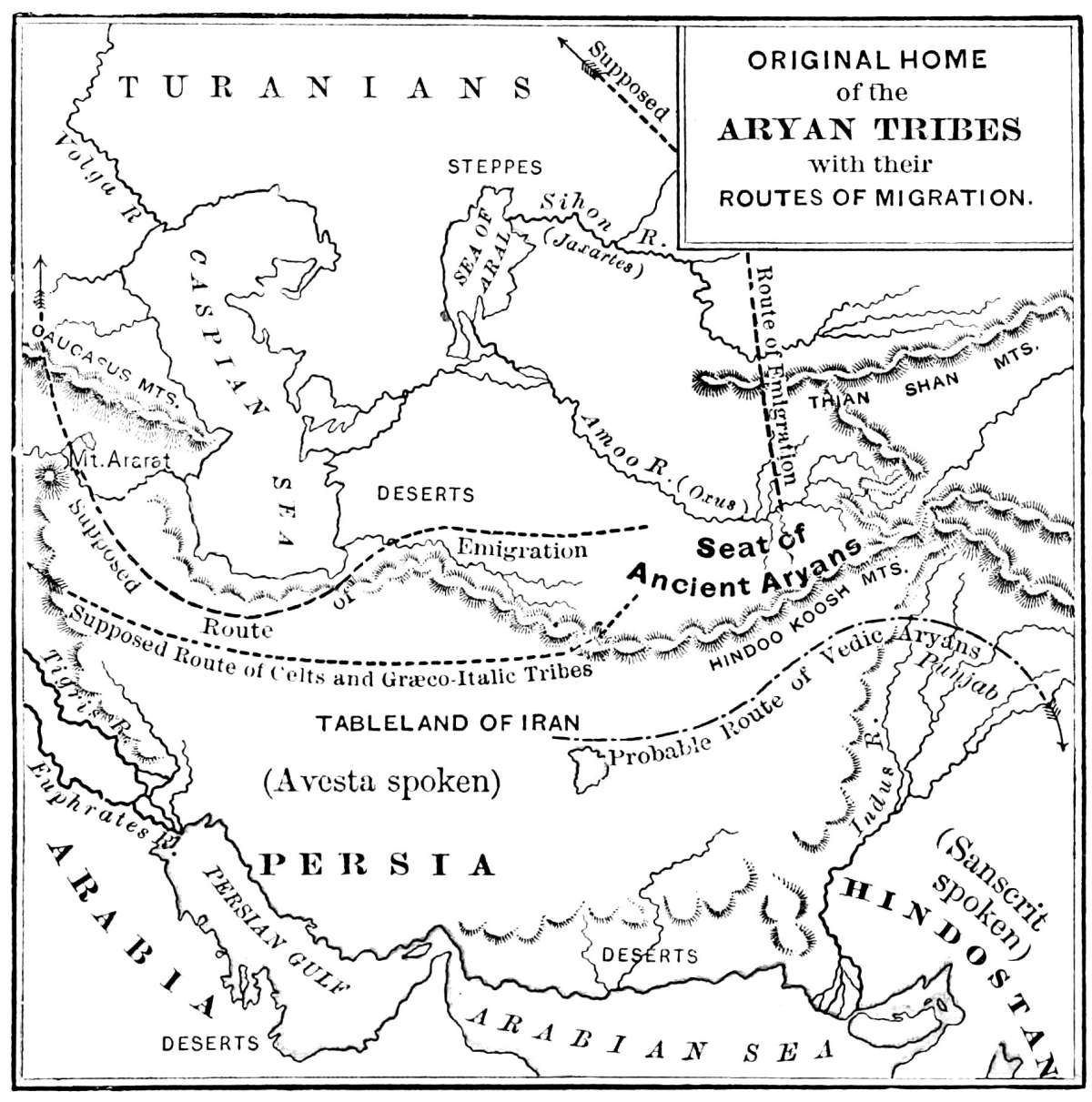 The Dawn of History.—When the mist that envelops the early history of the world first rises, it discovers to our view, in parts of western Asia, communities more or less advanced in knowledge and the arts, gathered about certain centres of civilization; and others, of less culture, leading a wandering life, spent mostly, we may conjecture, in the chase, in predatory excursions, and the tending of herds. We find at this time a thrifty race, called Aryans (är’yanz), settled in the district between the Hindoo Koosh Mountains and the upper course of the Amoo—the ancient Bactria (part of what is now Turkestan and Afghanistan; see Map, p. 15). The region watered by the rivers Euphrates and Tigris was occupied by the forefathers of the Chaldeans and Assyrians, the Jews and Arabians; while over the plains of Tartary, known as Turan, wandering tribes were spread—whence their name, Turanians, swift horsemen. Corresponding with these three divisions of the human race are three distinct families of languages,—the Aryan or Indo-European, the Semitic, and the Turanian,—embracing more than one hundred and fifty tongues. (See Rawlinson’s “The Origin of Nations.”)