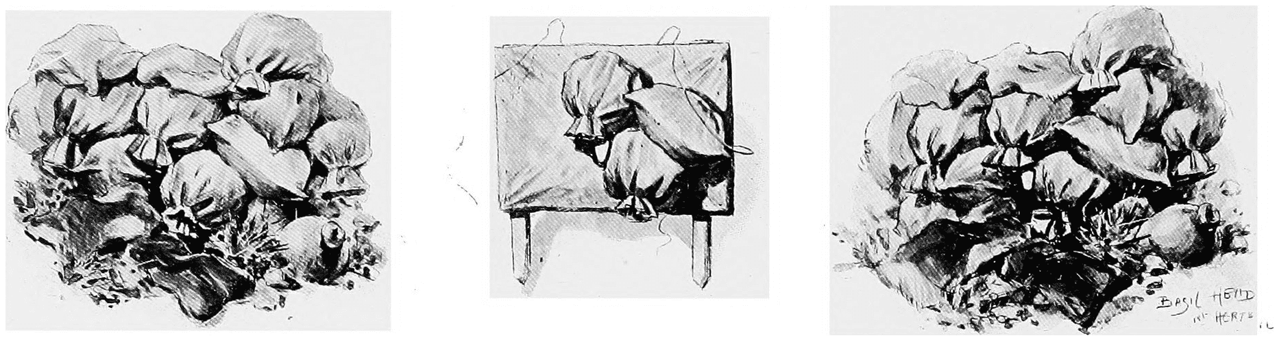 Method of inserting Loophole. 1. Original Section of Parapet; 2. How bags are arranged and fixed round loophole to imitate original parapet (Gray’s Boards.); 3. Parapet reconstructed with loophole | 64 |