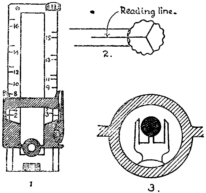 The sight is fitted with a fine adjustment in the form of a worm screw with a milled head. By rotating the milled head clockwise we raise the elevation, and by turning it anti-clockwise we lower it. The top of the milled head is marked off into three divisions, each of which is equivalent to one minute of angle, which is about 1″ per 100 yards of the range. Thus at 100 yards it would equal 1″ rise, or fall, on the target; at 200 yards 2″; at 300 yards 3″, and so on. A reading line is marked on the top of the sight leaf to enable these minute adjustments to be made. (See diagram.)