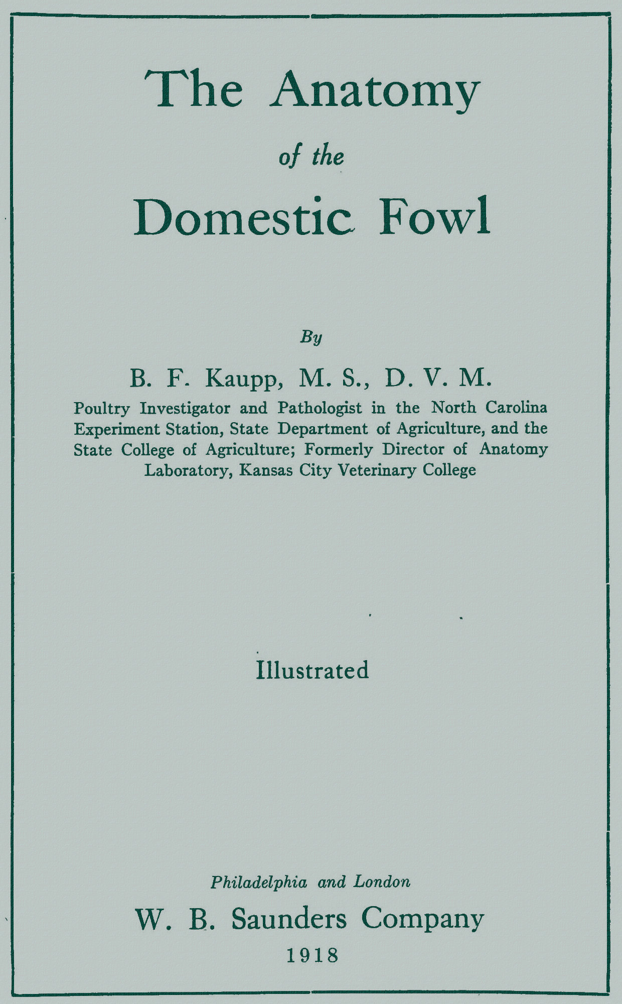 Advanced work in the study of poultry husbandry is now being done in this country, to a greater or less extent, at all the two score and more Agricultural and other Colleges and Experiment Stations. From these institutions comes the demand for a text-book on the Anatomy of the Domestic Fowl. No complete text-book on the subject, up to the present, has existed. It is with the hope of meeting the demand that this book is published.