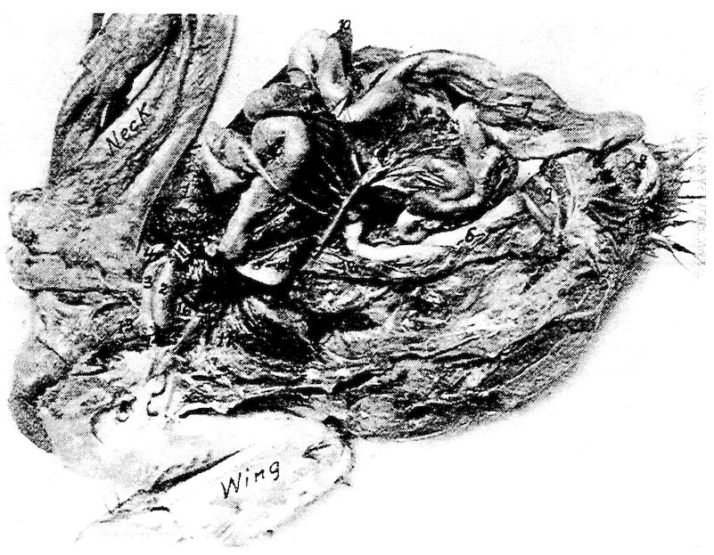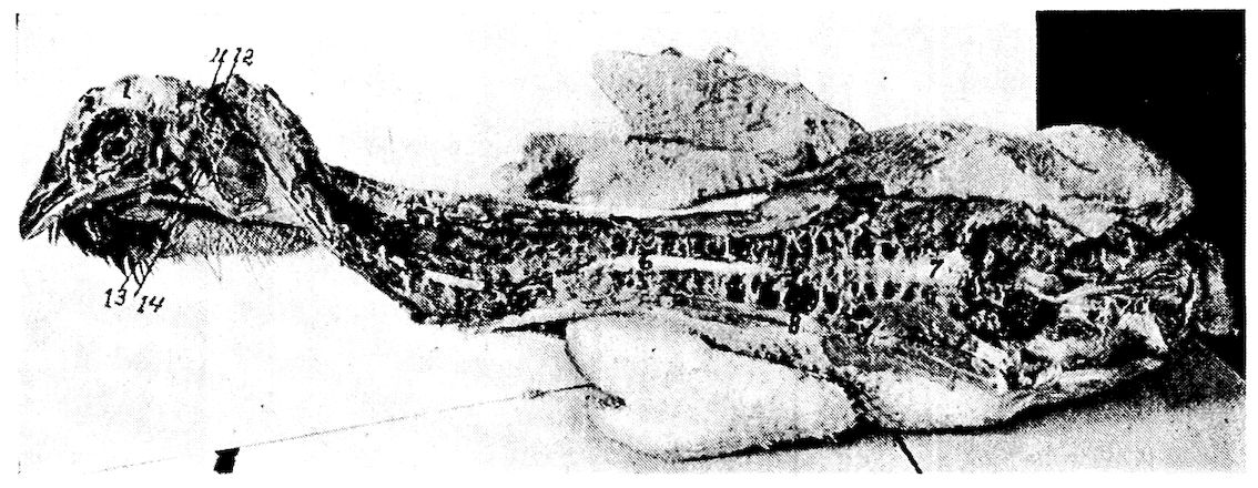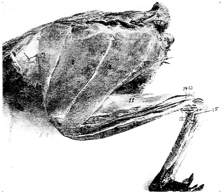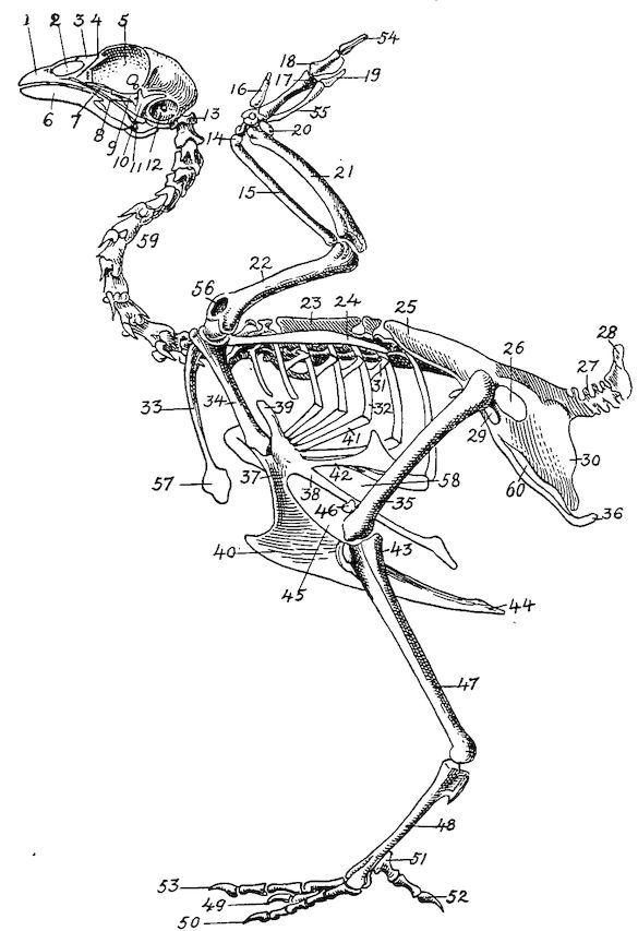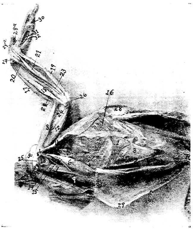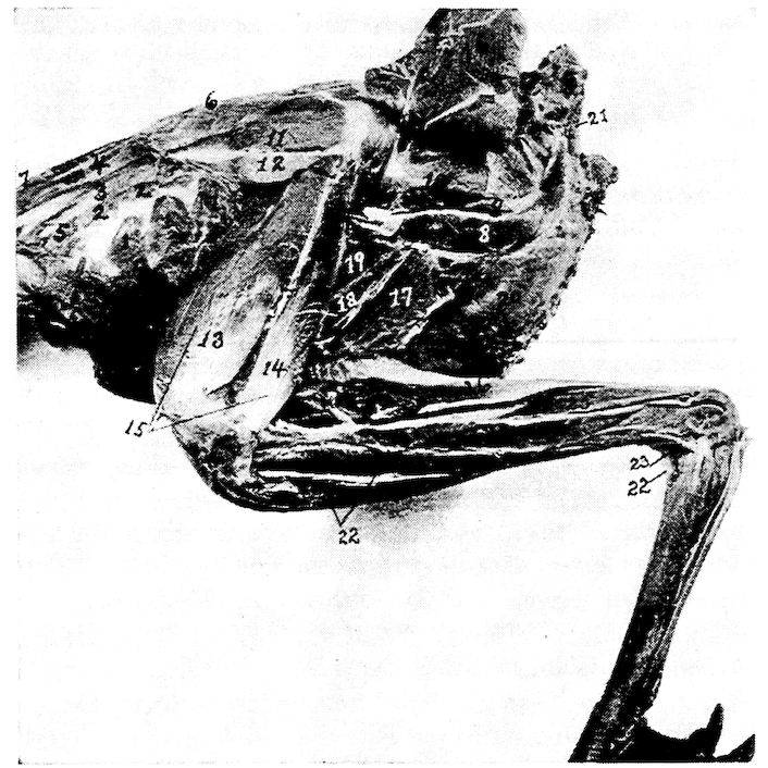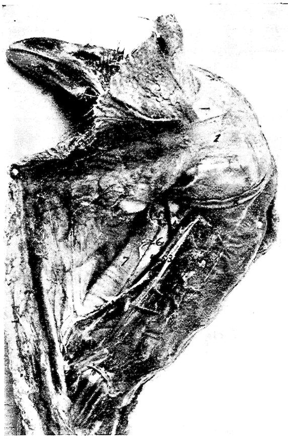 The first dissection should be to lay bare the dermal muscles. The dermal muscles are of two kinds, true dermal and dermo-osseous. The dermal muscles have their origin and insertion in the skin, and control the movements of the different groups of feathers. The dermo-osseous have their origin on some part of the skeleton, and insert to the integuments.