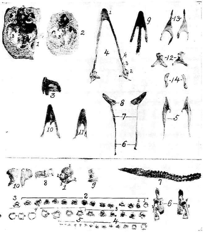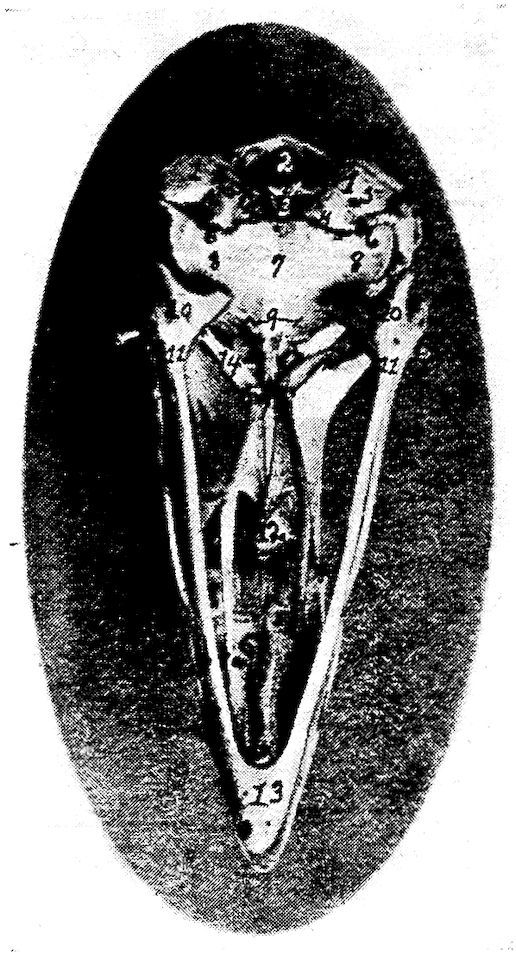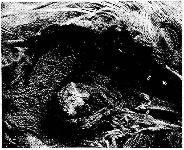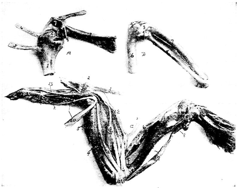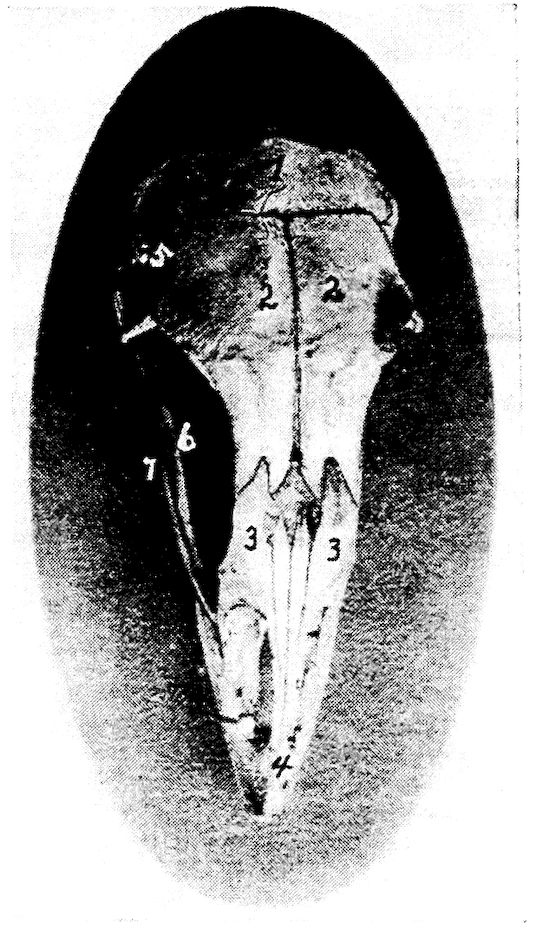 The muscles may be studied in groups as outlined in the text. 344Make an incision through the skin down to the bone on the superior part of the head, parallel and close to the base of the upper mandible, and extending completely across. From the outer end of this make an incision backward and down to the skull and posteriorly. The muscles of the upper part of the neck will then be exposed. The straight incision should extend to about a half inch on the inside of the upper eyelid of the same side. Reflect the flap of skin from the top of the skull, and carefully examine the under side of it in the median line, where it overlies the frontal region. The dermo-frontalis will be observed if it be present. In many birds, especially in females, it may not be discernible, and may be considered absent. To expose the circumconcha make an incision completely around the ear; then carefully dissect to the ear base. A dermal circular muscle should be observed. To expose the dermo-temporalis extend the longitudinal incision down the back of the neck to a point between the clavicular heads, carrying it just through the skin and about one-fourth of an inch to the side of the median line. Remove the skin from the throat and the anterior portion of the chest. Lay open the alar and parapatagial duplicatures of the skin. This exposes a number of dermal muscles. The dermo-temporalis is now observed to extend from a small depression just above and anterior to the temporal fossa. It makes slight attachments to the temporal muscle, which it covers, and extends backward as a thin ribbon-shaped muscle, the fibers blending with those of the cleido-trachealis, and becomes lost upon the skin in front and opposite the shoulder-joint. At times its fibers blend with those of the dermo-tensor patagii.