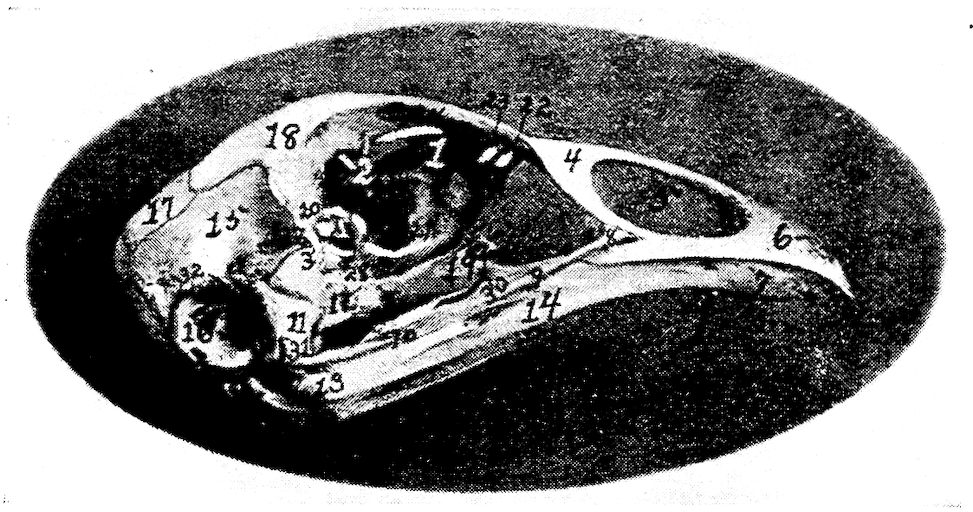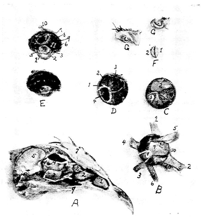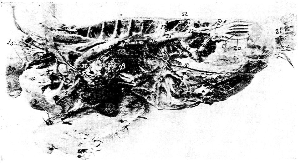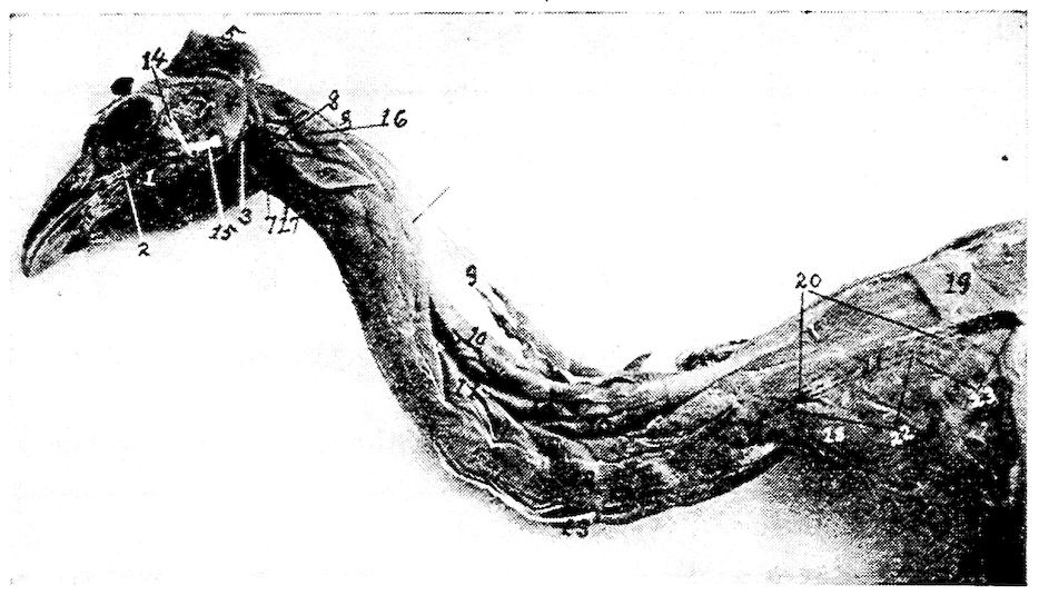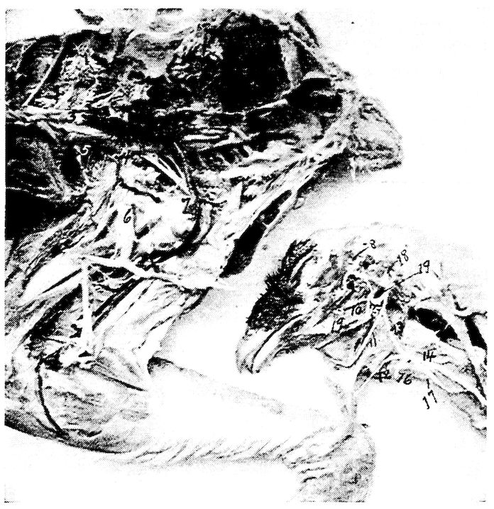 Special Technic for the Dissection of Cranial and Spinal Nerves.—It is rather difficult to dissect the cranial and spinal nerves of the fowl, owing to the fact that the structures are very small. The bone is rather hard and the nerve tissue so delicate that great skill must be attained to achieve any degree of success.