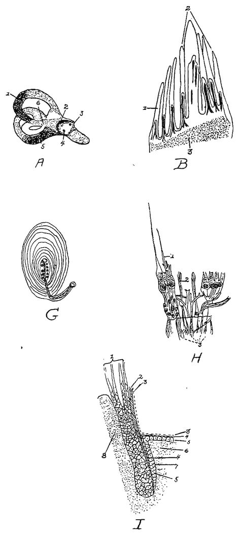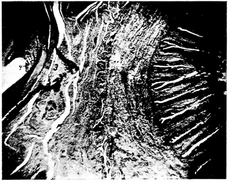 IV. Bleaching. The bleaching fluid used is hydrogen peroxid to which ammonia is added until a white precipitate forms. The proportion is approximately two parts of peroxid and one of ammonia. The material is bleached until all the color is removed 351and the tissue looks perfectly clear or slightly opaque. It may be quite transparent as the protein coagulate is somewhat white, but all yellow or reddish color should be bleached away.