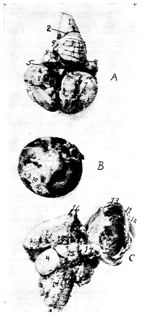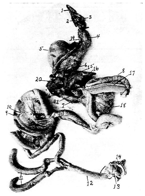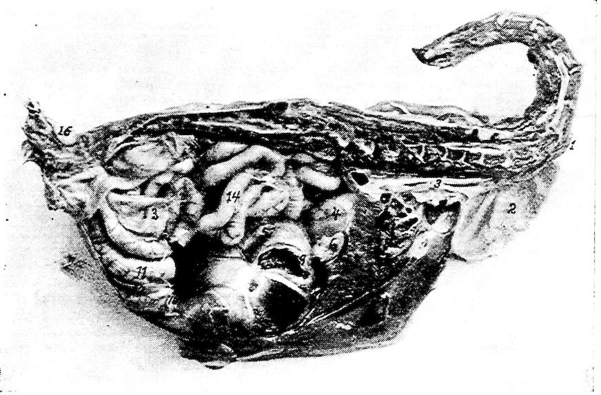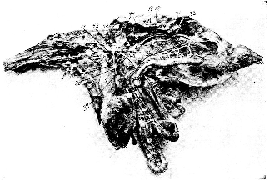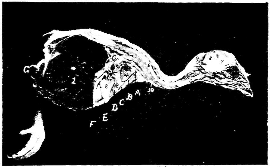 Directions for the Study of the Viscera.—Carefully remove the right and the left abdominal and thoracic walls, allowing a strip of tissue to remain in the median line to hold the organs in their normal position. To open these cavities it is necessary to use the 345bone saw and the scalpel. The organs may now be studied from each side. To make a longitudinal section through the median line, select a small bird, one weighing not more than 2 pounds, kill, and preserve in a 10 per cent. solution of formaldehyde for three days. Then with a sharp, thin, long-bladed knife make an incision at one sweep through the median line of the body down to the back bone, and with the bone saw section through the vertebræ. If it is difficult to cut through the breast-bone, saw through before making the incision. In small birds the entire cut may be made without the aid of the saw.