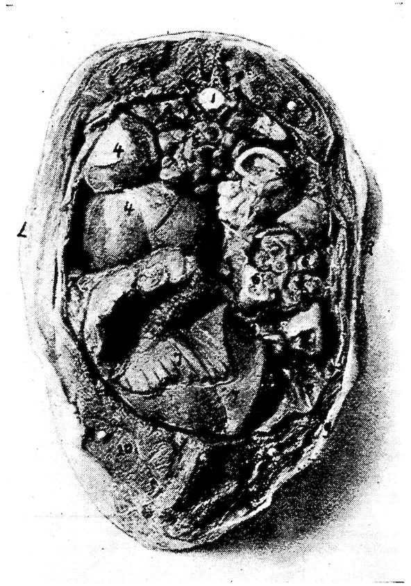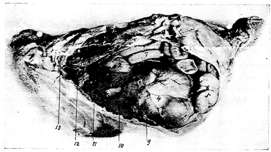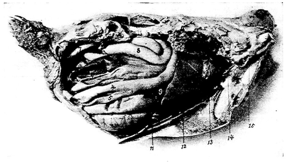 Figure 84 illustrates some essential equipment for the dissection laboratory. The equipment should consist of a pump, No. 1, which forces air through the rubber tube, No. 2, into the pressure tank, No. 4, which is guarded by the valve at No. 3. A dial, No. 5, indicates the pressure of the air within the tank. The air as needed is released through an outlet valve. The air now passes through the rubber tube, No. 6, into the left arm of the manometer at No. 7. The manometer is simply a glass tubing filled with mercury to the point indicated at No. 7. By the side of the opposite arm there is made a scale graduated in centimeters. The tube at No. 9 being attached to the Y-tube, conveys air under the same pressure into the injection chamber as that supporting the column of mercury 352of the manometer. It is necessary to have a pinch cock, as indicated at No. 11, to control the liquid within the tube. No. 12 illustrates the tube in the end of which, No. 13, there is inserted a trocar which is introduced into the artery and tightly tied with a cord.