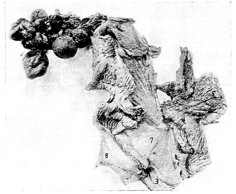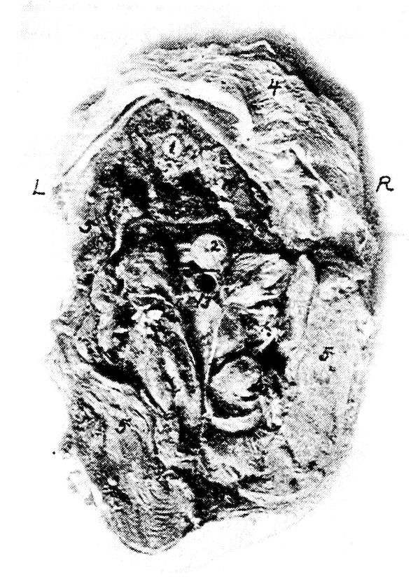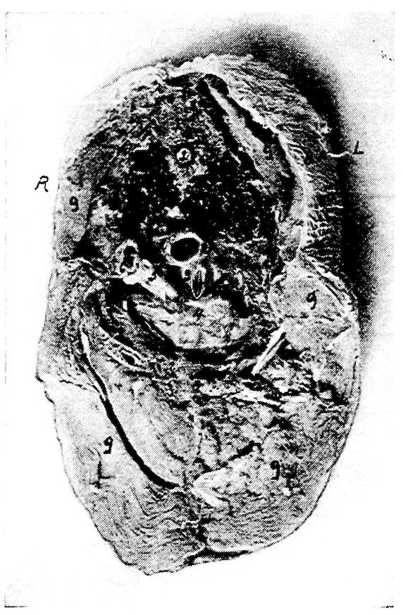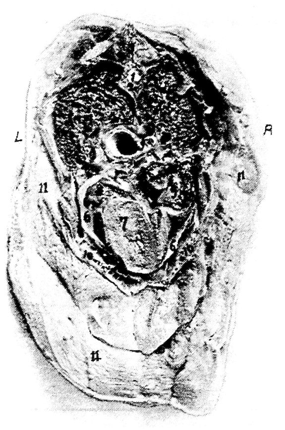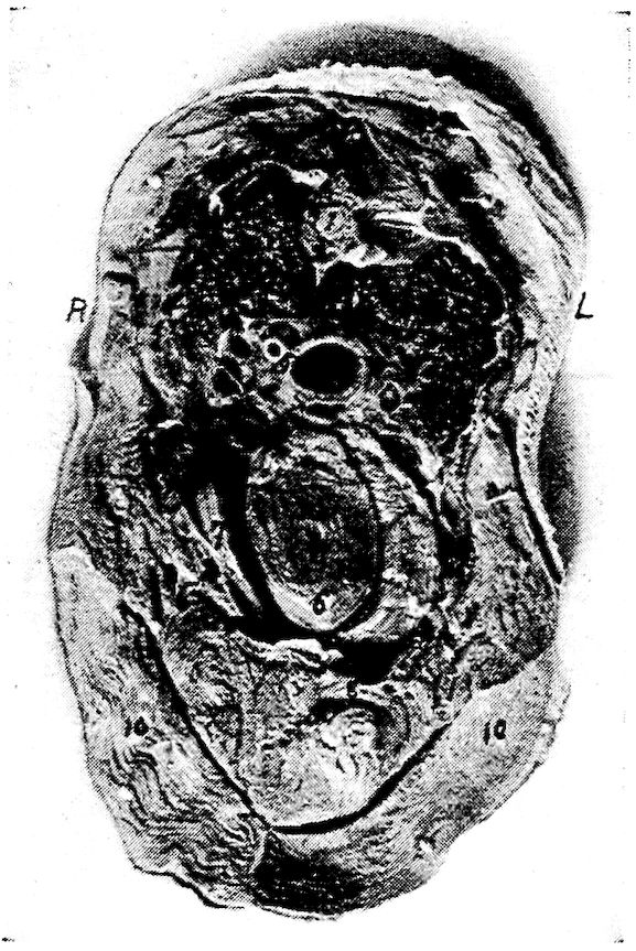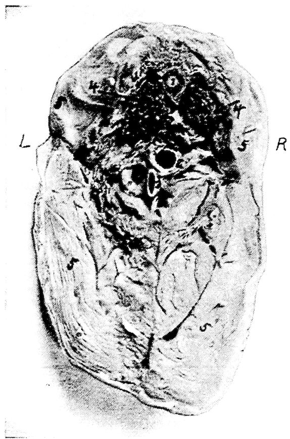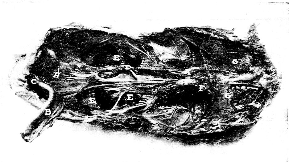 I. Preparation of the fresh tissue. If any parts are to be made conspicuous, as blood-vessels, or the lymphatic system, they must be injected with an insoluble, unbleachable substance. Spalteholz recommended carmine or methylene blue, and carbon. I have found Higgin’s ordinary black carbon ink excellent for this purpose. The system or systems are injected with this substance while the tissue is perfectly fresh.