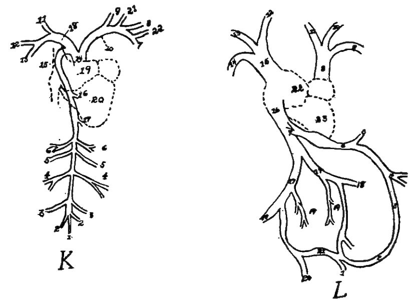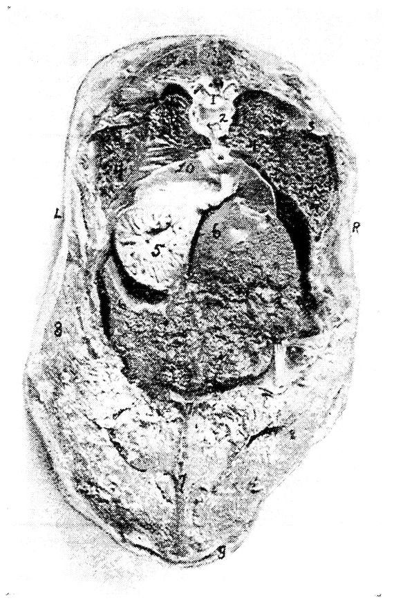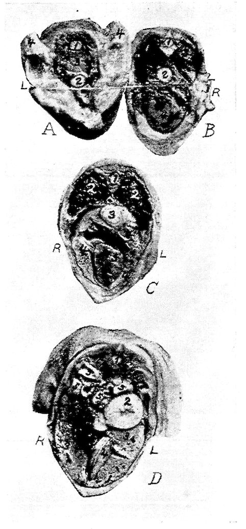 The injection should be done under 120 millimeters pressure. The stop cock of the pressure chamber is released sufficiently to raise the mercury in the U-tube six centimeters, which multiplied by 2, the amount of work required to raise two columns, makes 120 millimeters pressure. If this pressure be maintained, all vessels should be injected without rupture. The same process may be used in injecting the air cells through the trachea.