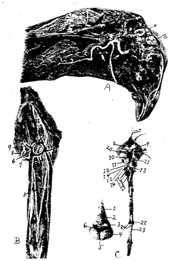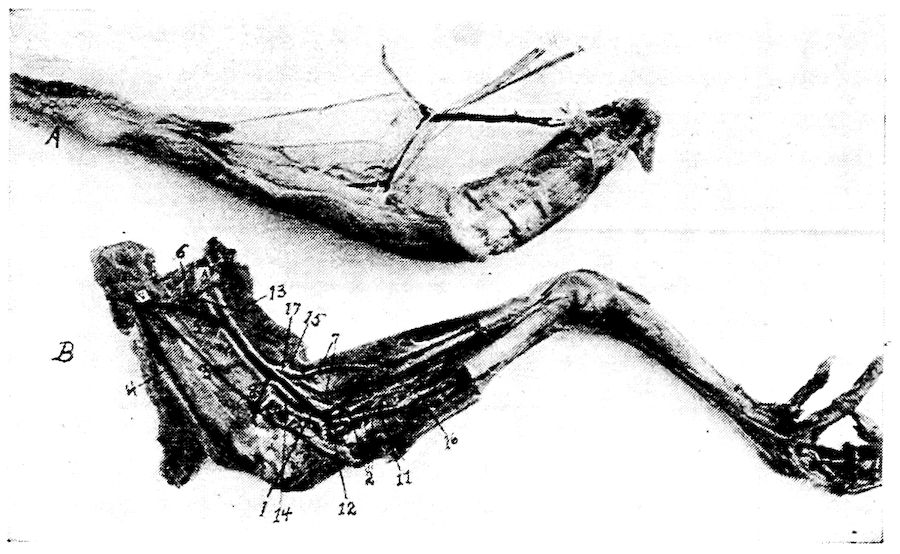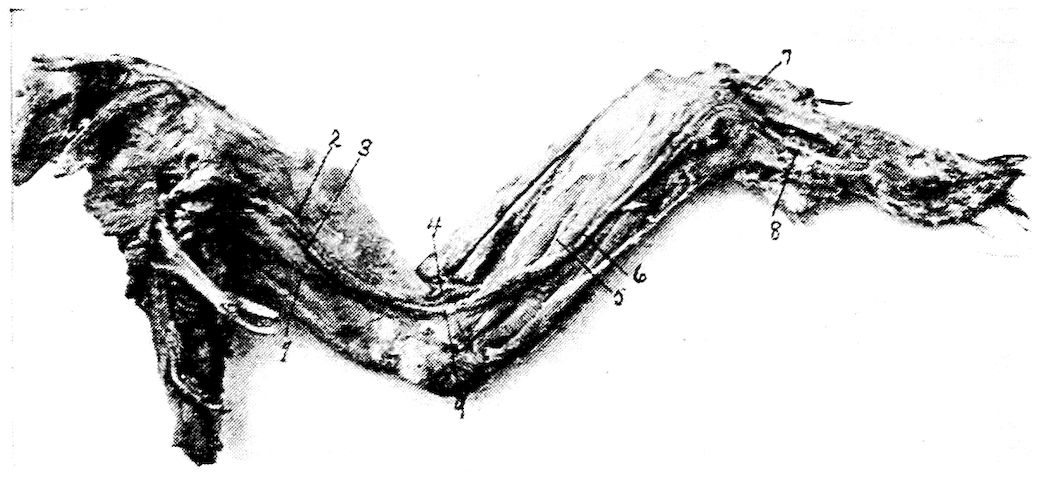 Select for arterial dissection an old cock, as in a bird of this kind the arteries are larger and the difficulties are reduced. Select for bleeding and injection the ischiadic artery in the thigh region. With the sharp point of the thin blade of a knife make an incision lengthwise of the artery being careful not to strip back the endothelial lining of the artery. Allow as much of the blood as will escape before injecting; in fact, the arteries should be thoroughly emptied, so that there is no longer danger of a clot’s plugging some vessel and thus preventing its filling. Since the blood of most birds coagulates in about thirty seconds, this work must be done rapidly, care being exercised to keep the flow running as long as possible. After bleeding is completed, insert the cannula and tie the vessel tightly around the cannula to prevent the escape of the injecting fluid. See that all connections are sufficiently tight to prevent the escape of liquid under pressure. After the injection is completed, remove the cannula and tie the artery with a small twine, preferably cotton. Quickly remove all injecting fluid from the needle, the tubing, and the injecting chamber.